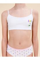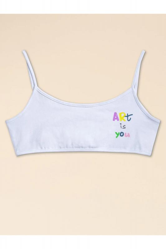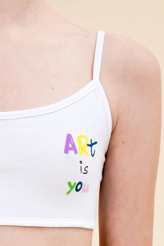 Если вы хотите купить своему ребёнку действительно качественное, красивое и комфортное нижнее бельё, представляем вам наш укороченный топ для девочки. Бра выполнено из ткани с высоким содержанием хлопка. Топ мягкий, воздухопроницаемое — кожа ребёнка отлично дышит. Эластан в составе ткани обеспечивает модели прекрасную форму на протяжении долгого времени. Благодаря качественному материалу и правильному крою детский топ идеально садится по телу и дарит ребёнку комфорт на протяжении всего дня. Тонкие мягкие бретели не сползают, исключают трение и раздражение. По низу и проймам окантовка из пайпинга в тон изделия, благодаря чему они не растягиваются. Модель белого цвета украшает небольшой принт по переду. Надпись переводится: "