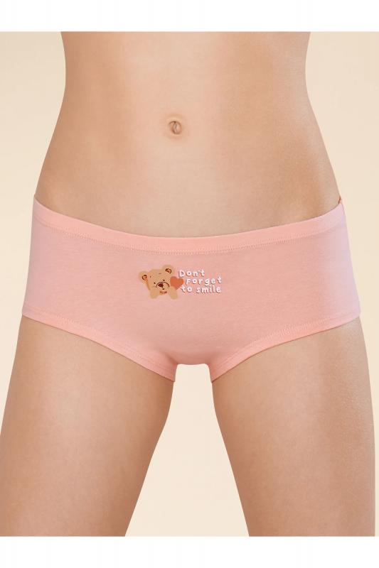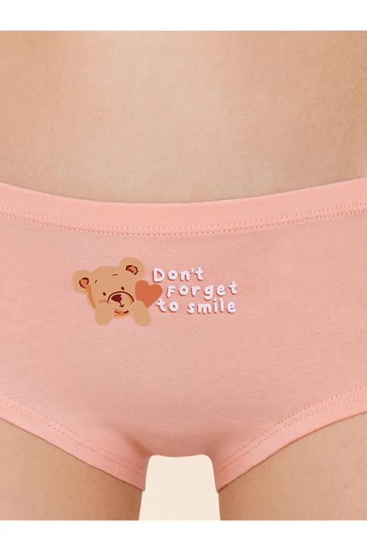 Комплект трусов для девочки из 2-х шт. Шорты выполнены из ткани с высоким содержанием хлопка, что делает их мягкими, гипоаллергенными и дышащими. Благодаря эластану шорты трусы в течение длительного времени сохраняют первозданную форму. Качественный материал и грамотный крой обеспечивают идеальную посадку белья на теле. Мягкая резинка исключает раздражение и трение. В комплект входят трусы детские для девочки двух трендовых оттенков. Нежные и по-настоящему красивые, эти цвета обязательно придутся по душе любой девочке. Трусики для девочки украшены принтом: пудровые — в виде милого медвежонка с надписью (перевод «не теряй свою улыбку»), молочные — в виде трёх милых медвежат. Принты эластичные и стойкие, без проблем переносят частые стирки. Хлопковые трусы подходят девочкам младшего школьного возраста и девочкам-подросткам. Помните о правильном уходе за изделием: рекомендуется стирать при температуре не выше 30 °C, без предварительного замачивания, с изнанки. Это поможет сохранить качество и цвет белья на длит