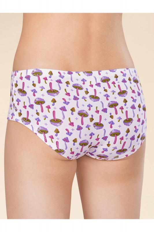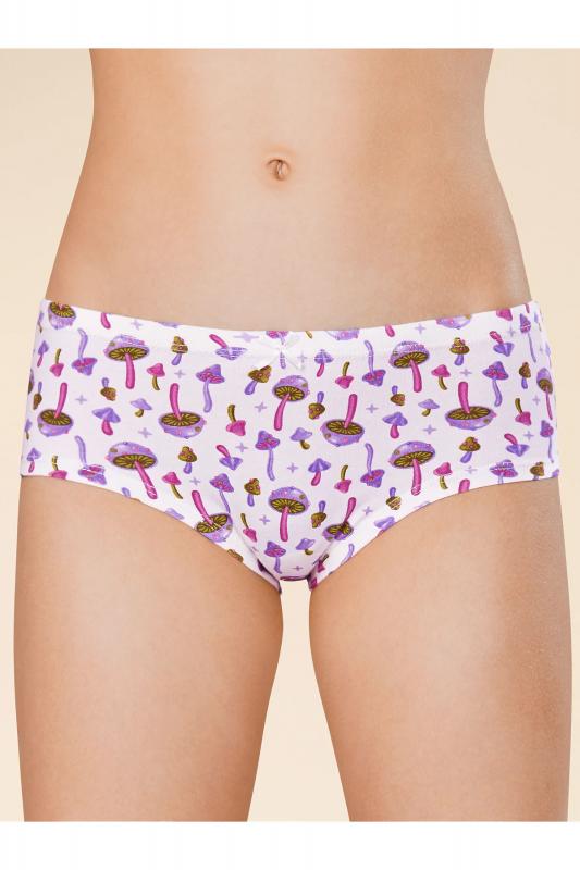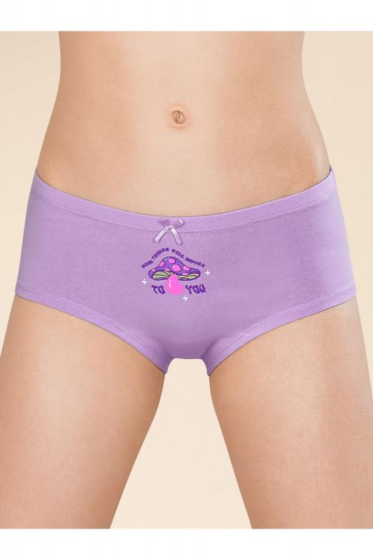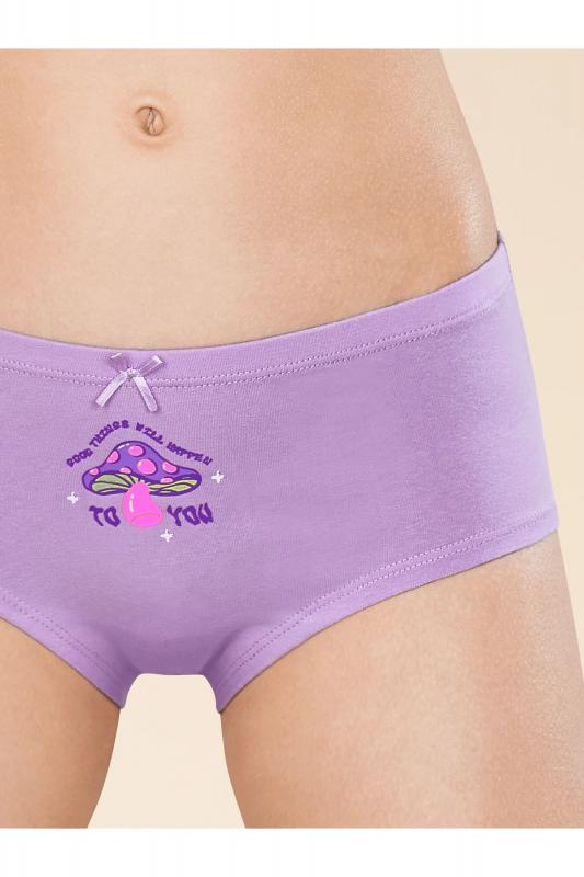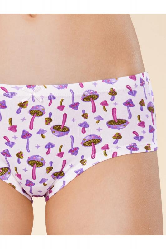 Комплект трусов для девочки из 2-х шт. Шорты выполнены из ткани с высоким содержанием хлопка, что делает их мягкими, гипоаллергенными и дышащими. Благодаря эластану шорты трусы в течение длительного времени сохраняют первозданную форму. Качественный материал и грамотный крой обеспечивают идеальную посадку белья на теле. Мягкая резинка исключает раздражение и трение. В комплект входят трусы детские для девочки двух трендовых оттенков. Нежные и по-настоящему красивые, эти цвета обязательно придутся по душе любой девочке. Трусики для девочки украшены принтом: сиреневые — в виде грибочка с надписью (перевод «хорошие вещи произойдут с тобой»), молочные — сплошным принтом в виде грибочков. Принты эластичные и стойкие, отлично переносят частые стирки. Хлопковые трусы подходят девочкам младшего школьного возраста и девочкам-подросткам. Помните о правильном уходе за изделием: рекомендуется стирать при температуре не выше 30 °C, без предварительного замачивания, с изнанки. Это поможет сохранить качество и цвет белья н