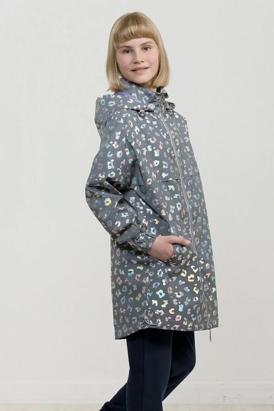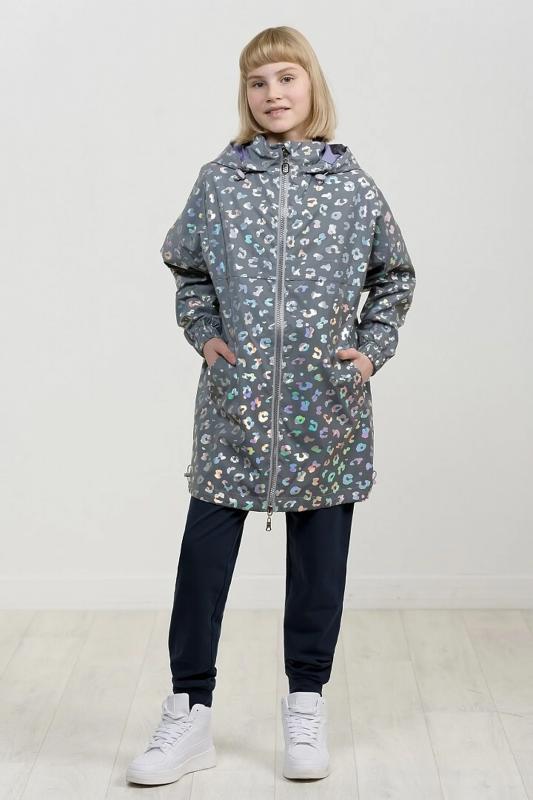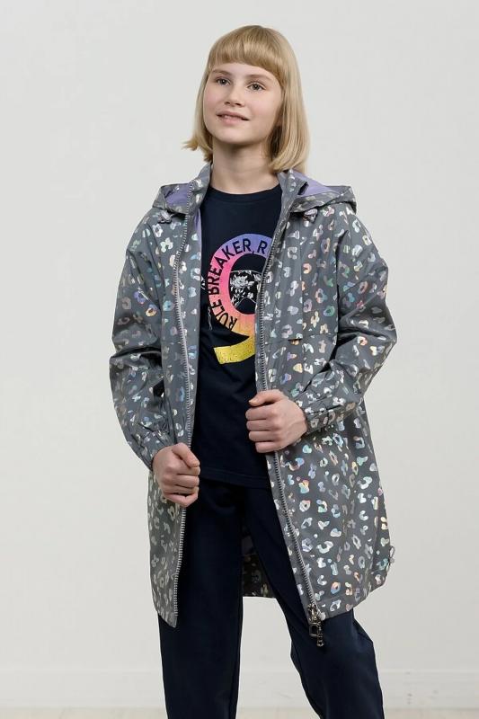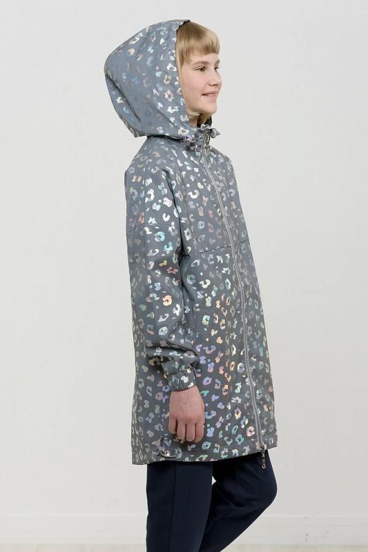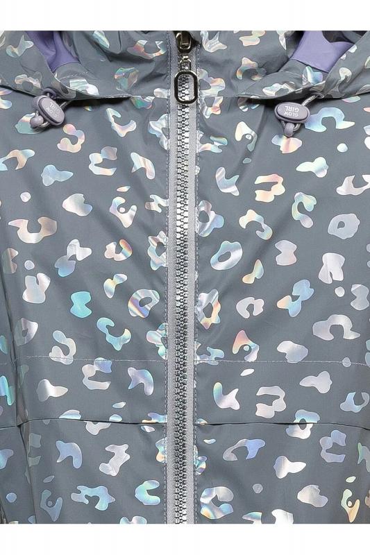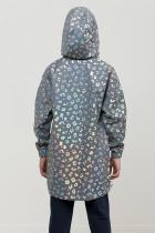 Плащ на тонком подкладе. Рекомендуемый температурный режим не ниже плюс 10 градусов. Ткань со световозвращающим покрытием и голограммным серебряным металликом. Водоотталкивающее покрытие. Куртка силуэта бочонок с сильно спущенной линией плеча и объемным рукавом. Карманы прорезные с листочкой. Тракторная молния с серебряным напылением. Стопперы в капюшоне декорированы надписью с серебряным покрытием. Объем по низу изделия регулируется эластиком со стопперами.