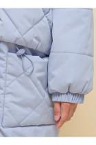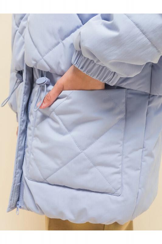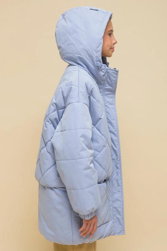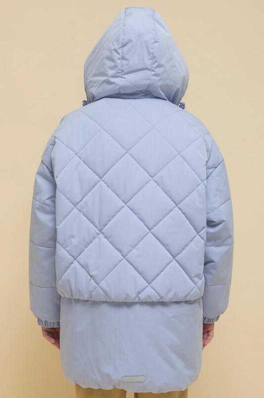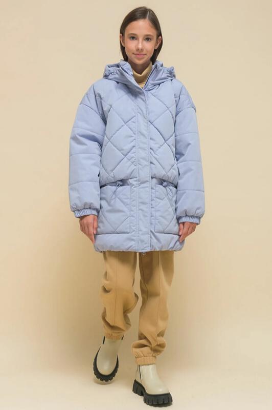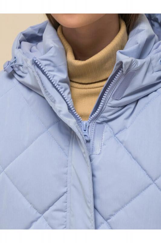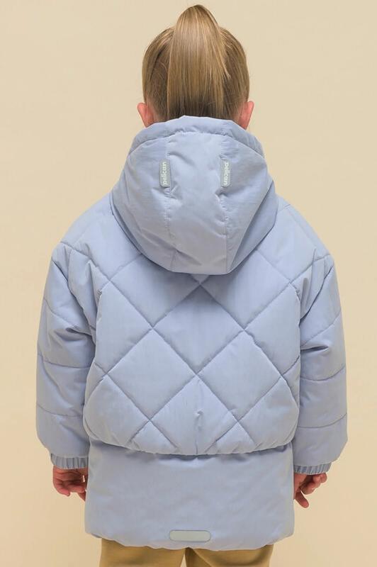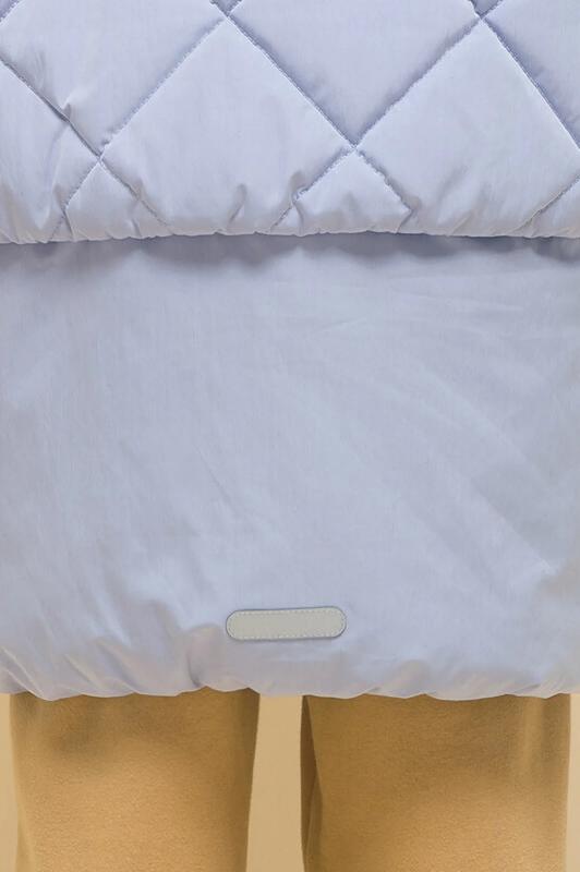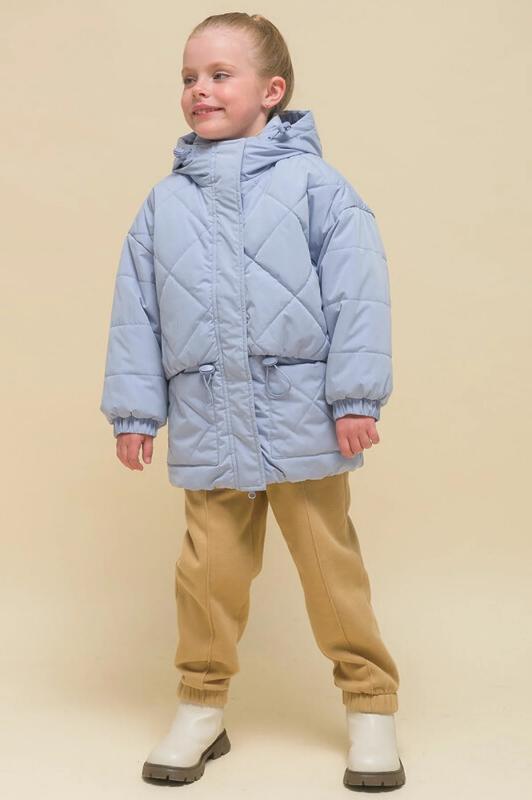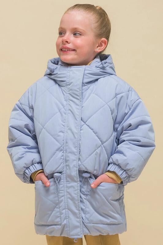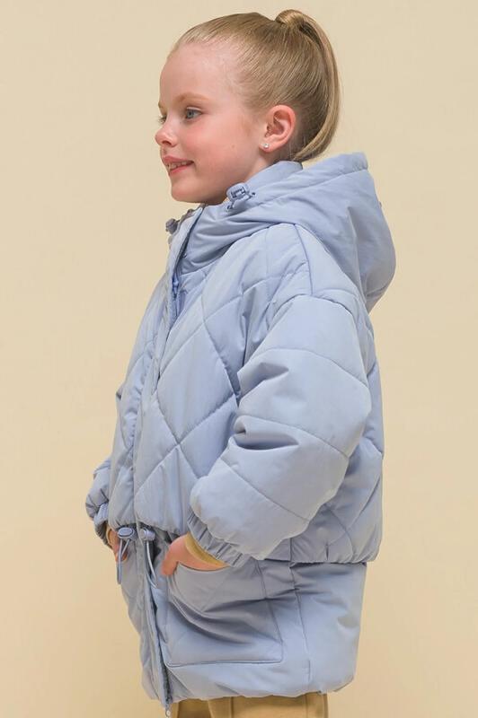 Куртка детская демисезонная на синтепоне для девочек, прямого силуэта. Изделие выполнено из курточной ткани с эффектом peach (в переводе с английского — персик, тактильно приятный, бархатистый материал) с водоотталкивающим покрытием — ребёнок не промокнет под дождём. Капюшон двухшовный, что обеспечивает анатомически правильную форму и комфортную посадку по голове. Капюшон не отстегивается, предусмотрена регулировка объема эластичными шнурами с пластиковыми стопперами. Центральная застёжка на молнию, разъёмную с двух сторон — удобно садиться. В пуллере вставлен эластичный шнур с запаянными концами — модный элемент. Куртка тёплая — дополнительно, для защиты от ветра и холода, центральная молния закрыта ветрозащитной планкой на липучках (велькро). Верхняя часть переда и спинки имитирует надетый поверх жилет со стежкой-ромб — оригинальная и стильная деталь, по низу собрана на комфортную широкую резинку, также есть дополнительная регулировка эластичным шнуром со стопперами. Куртка стёганая по переду дополнена нак
