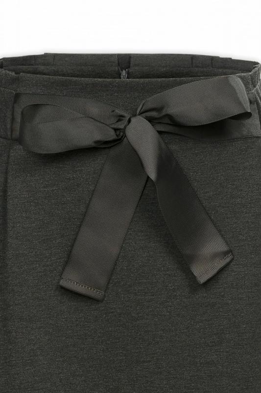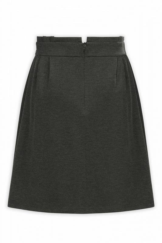 Юбка для девочек А-силуэта из плотного, но мягкого трикотажного полотна. Новинка. На спинке потайная молния в среднем шве. По бокам и на спинке обтачной фигурный пояс, в верхний край которого вшита декоративная деталь с защипами. Перед сложной формы, с вшитой репсовой лентой для завязывания на бант спереди или на узел сзади.