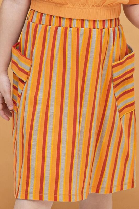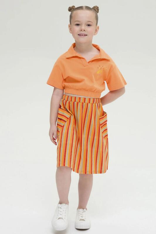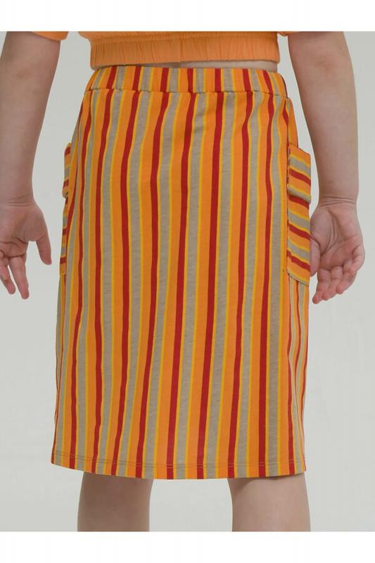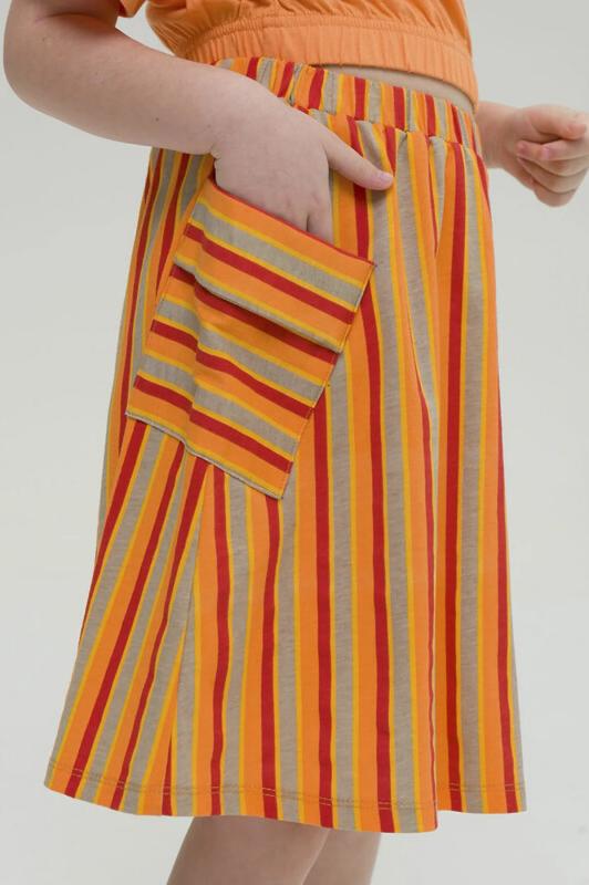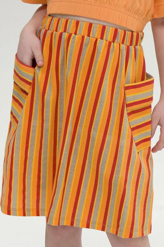 Модная трикотажная юбка для девочки на резинке - это практичный вариант на каждый день. Выполнена из воздушного хлопкового трикотажа принтованного в полоску - идеальна для жаркой погоды. Юбка, слегка расклешенная книзу, длиной до середины икры. По бокам два больших накладных наклонных кармана с клапанами привлекают внимание и делают юбку самой актуальной в этом сезоне. Широкая резинка не давит, не натирает - удобно и комфортно в течение всего дня. Легкая повседневная юбка займет достойное место в гардеробе девочки, подойдет как для ежедневной носки, так и для особых случаев.