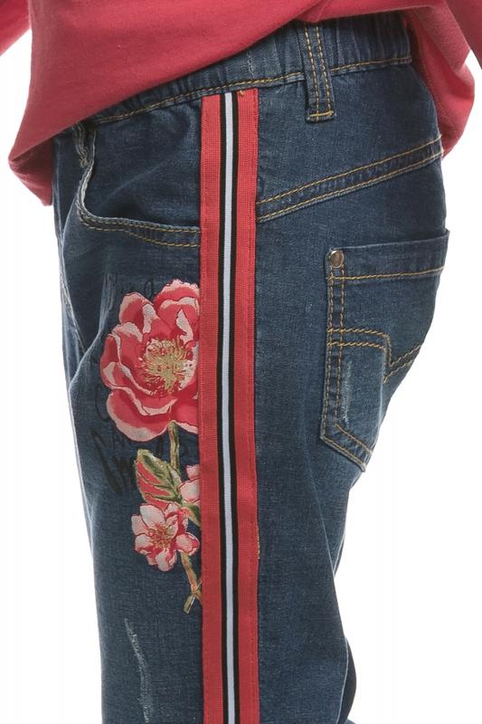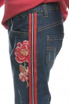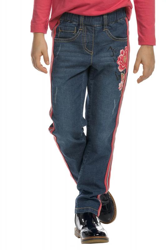 Джинсы для девочек. Джинсы Slim-силуэта из плотного, тонкого, эластичного хлопка. Полукруглые боковые карманы впереди и накладные карманы на спинке, металлическая фурнитура. Пояс на резине с внутренней регулировкой шнуром. Лампасы из декоративной тесьмы. Эластичный принт.