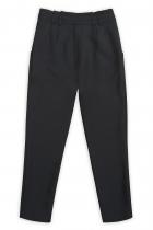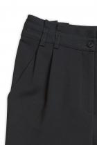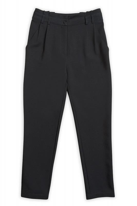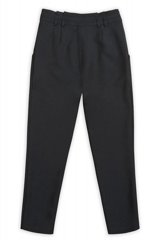 Швейные брюки для девочек, расширенные в области бёдер и зауженные книзу. Новинка. Талия на естественном месте. Спереди четыре складки. Боковые карманы, пояс со шлёвками, верхняя часть пояса с декоративной деталью со складками. Застежка на молнию спереди.