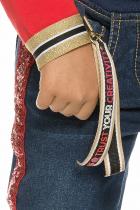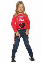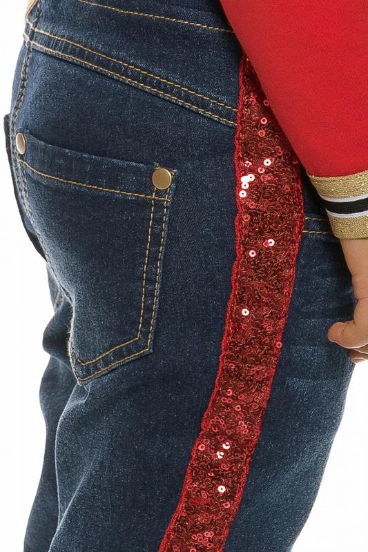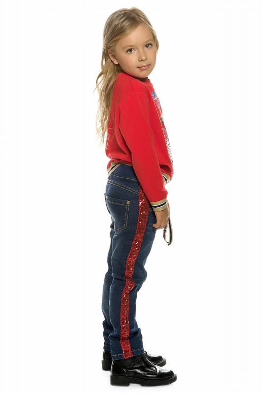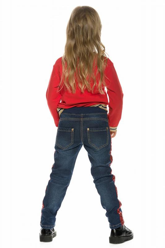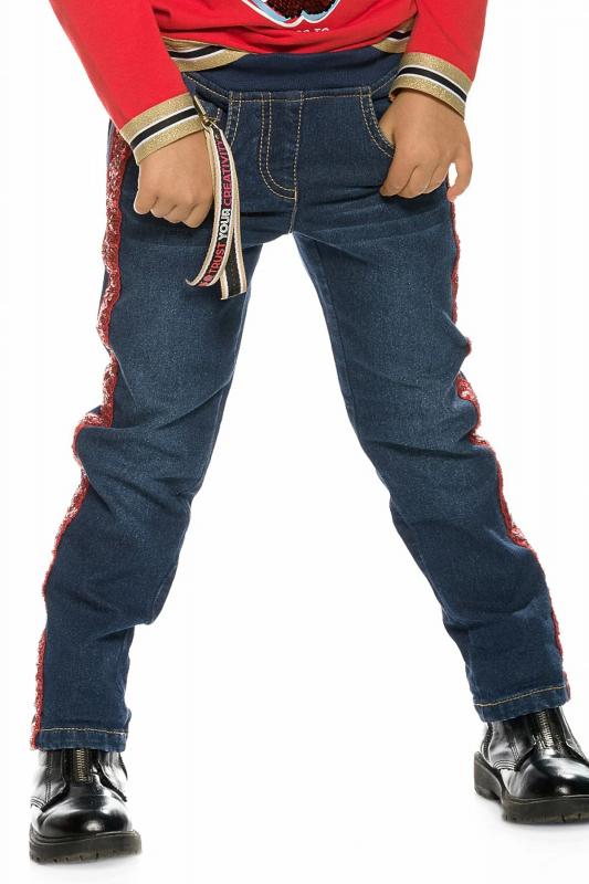 Джинсы для девочек с начёсом прямого силуэта, по бокам брючин декоративная капроновая тесьма с пайетками, по переду изделия золотистый карабин с принтованной репсовой тесьмой, перевод надписи Доверяй своему творчеству, пояс из эластичной рибаны с внутренней регулировкой шнурком.