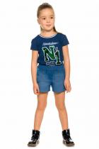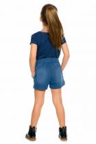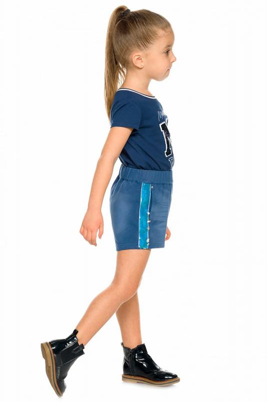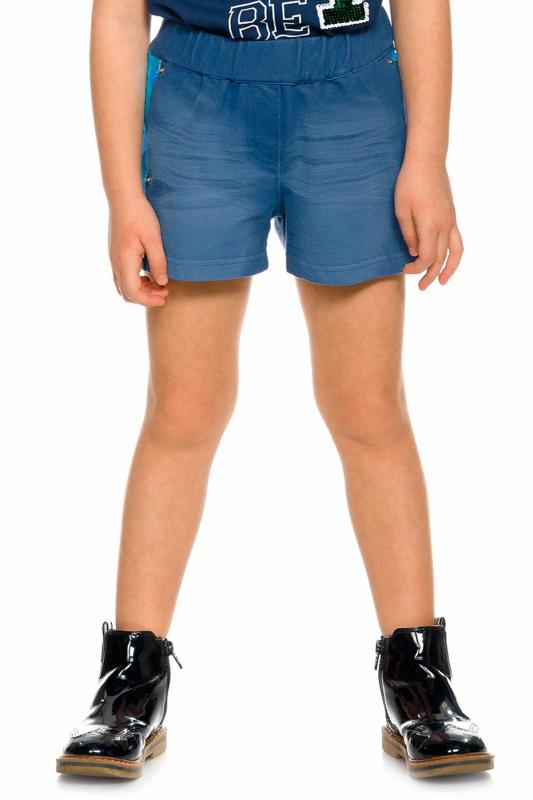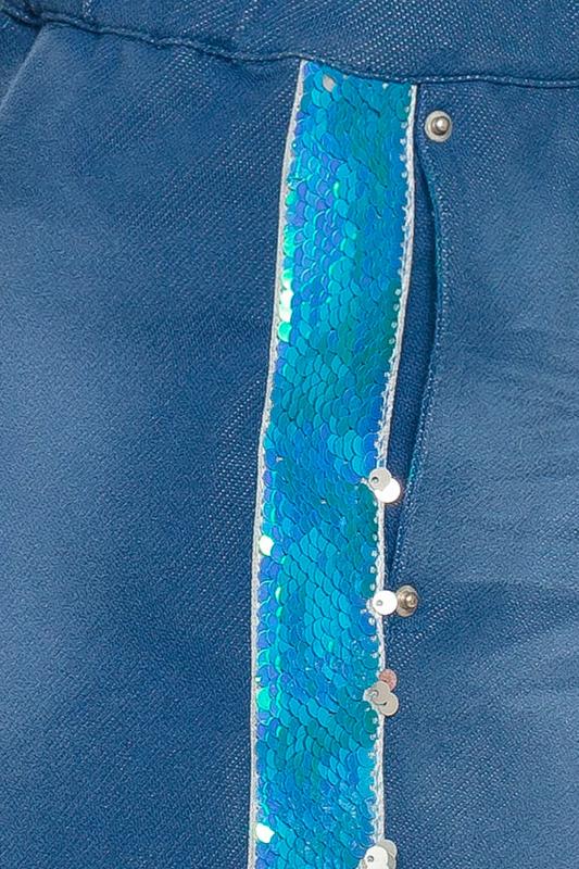 Свободные шорты из трикотажа, имитирующего деним. По бокам нашивные лампасы из переливающихся переворачивающихся пайеток. Карманы в боковых швах с металлической фурнитурой. Пояс на широкой внутренней резинке с регулировкой шнурком.