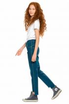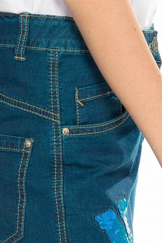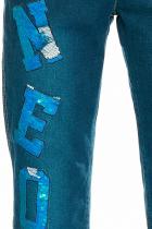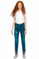 Джинсы для девочек. Новинка. Джинсы прямого силуэта SLIM из нового облегченного материала. Перепад длин по спинке и переду и необработанный низ в стиле деконструктивизм. Правая половинка джинсов украшена буквами-нашивками из переливающихся переворачивающихся пайеток. Полукруглые боковые карманы спереди и накладные карманы на спинке, металлическая фурнитура.
