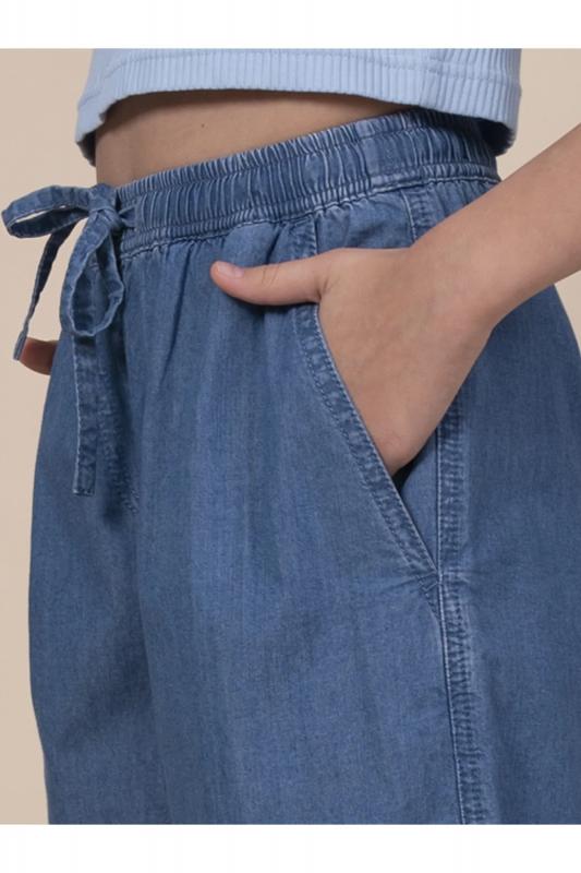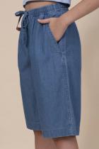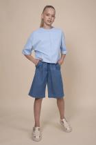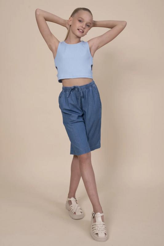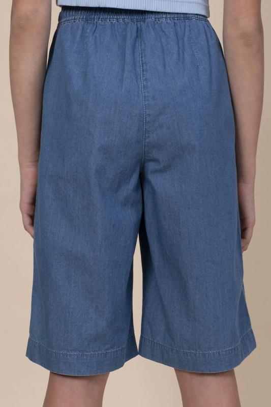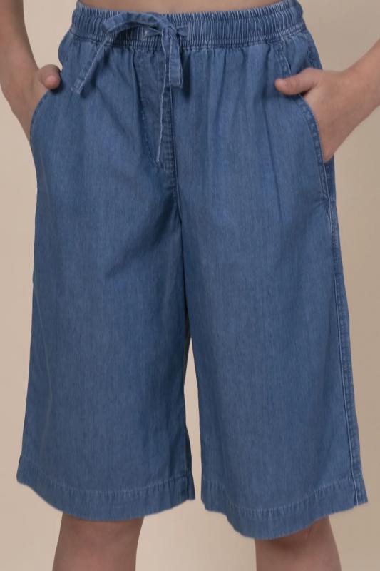 Шорты детские из тонкой джинсы для девочки. Широкие шорты длиной до колена подарят ребёнку комфорт и свободу движения. Модель без застёжки — быстро и удобно надевать и снимать. В поясе мягкая и широкая резинка — не давит и не перекручивается. Шнурок из основной ткани позволяет регулировать объём и посадку изделия. По центру переда имитация гульфика. По бокам удобные наклонные карманы. Шорты однотонные, без принта. За ними легко ухаживать. В составе ткани преобладает высококачественный хлопок — шорты мягкие и прекрасно пропускают воздух — кожа ребёнка дышит. Изделие выполнено в джинсовом синем цвете с актуальным эффектом мягкой варки garment wash. В линейке представлены следующие размеры: 3 (98): 4 (104): 5 (110): 6 (116): 7 (122): 8 (128): 9 (134): 10 (140): 11 (146). Подходят для девочек дошкольного и младшего школьного возраста, а также девочек-подростков. Шорты можно носить в детском саду, на прогулках, отдыхе и дома. Они прекрасно сочетаются с различными топами, джемперами, футболками. Джинсовые шорты дл