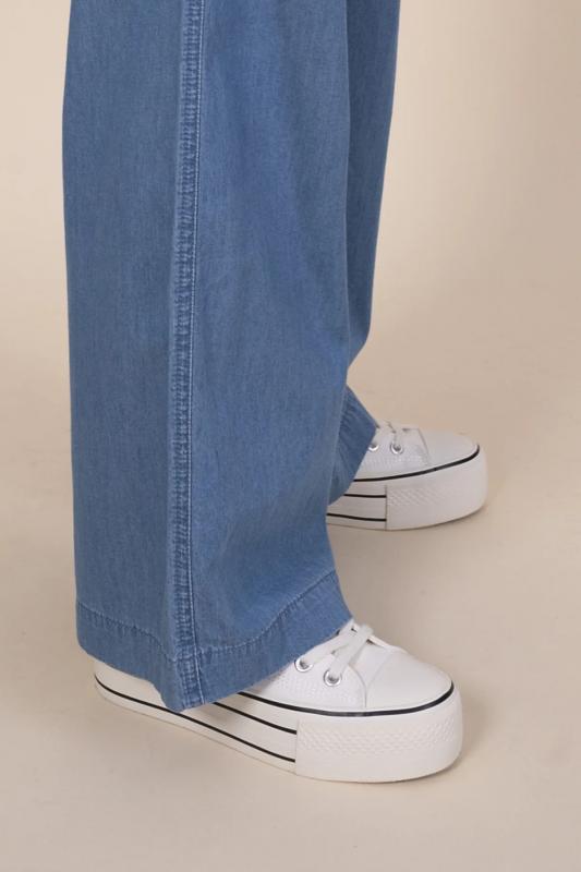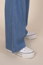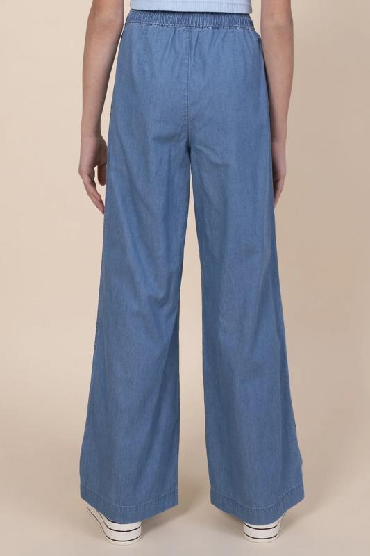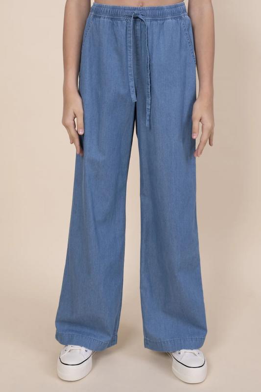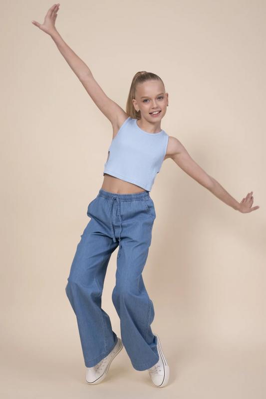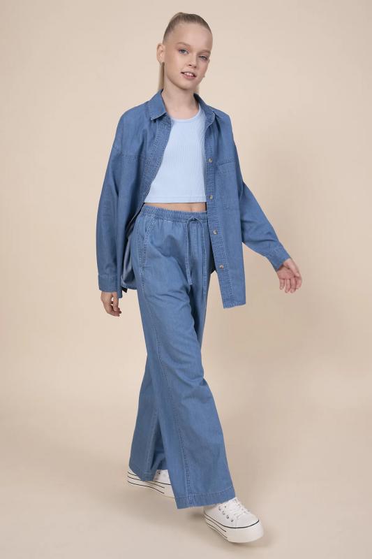 Джинсовые брюки палаццо для девочки. Свободные джинсы прямого кроя подарят ребёнку комфорт и свободу движения. Модель без застёжки — быстро и удобно надевать и снимать. В поясе мягкая и широкая резинка — не давит и не перекручивается. Шнурок из основной ткани позволяет регулировать объём и посадку изделия. По бокам удобные наклонные карманы. Джинсы однотонные, без принта. За ними легко ухаживать. В составе ткани преобладает высококачественный хлопок — брюки мягкие и прекрасно пропускают воздух — кожа ребёнка дышит. Изделие выполнено в джинсовом синем цвете с актуальным эффектом мягкой варки garment wash. В линейке представлены следующие размеры: 3 (98): 4 (104): 5 (110): 6 (116): 7 (122): 8 (128): 9 (134): 10 (140): 11 (146). Модные брюки подходят для девочек дошкольного и младшего школьного возраста, а также девочек-подростков. Брюки детские можно носить в детском саду, на прогулках, отдыхе и дома. Они прекрасно сочетаются с различными топами, джемперами, футболками. Джинсовые брюки для девочек — чудесный п