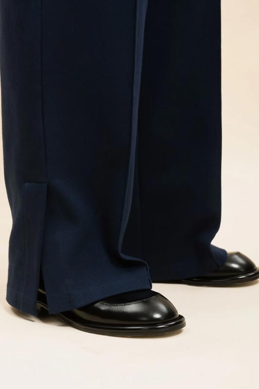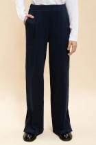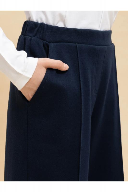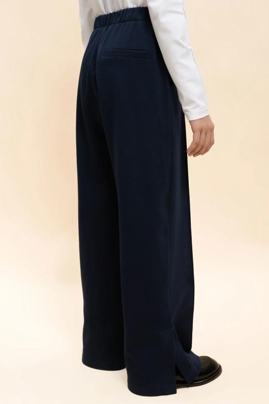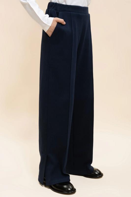 Трикотажные брюки прямого силуэта. Пояс на резинке по спинке с дополнительной встроенной утяжкой на резинку с петельками. По переду боковые карманы и застрочены стрелки. Имитация застежки, гульфика. По правой спинке имитация прорезного кармана с листочкой. По низу изделия в боковых швах располагаются шлицы