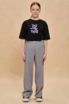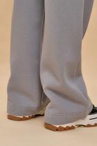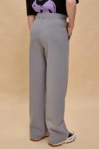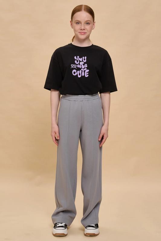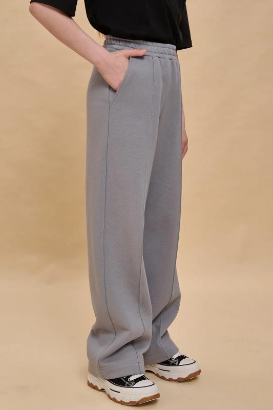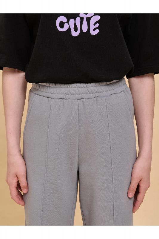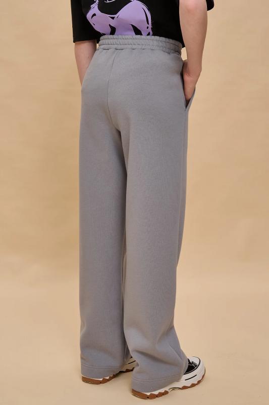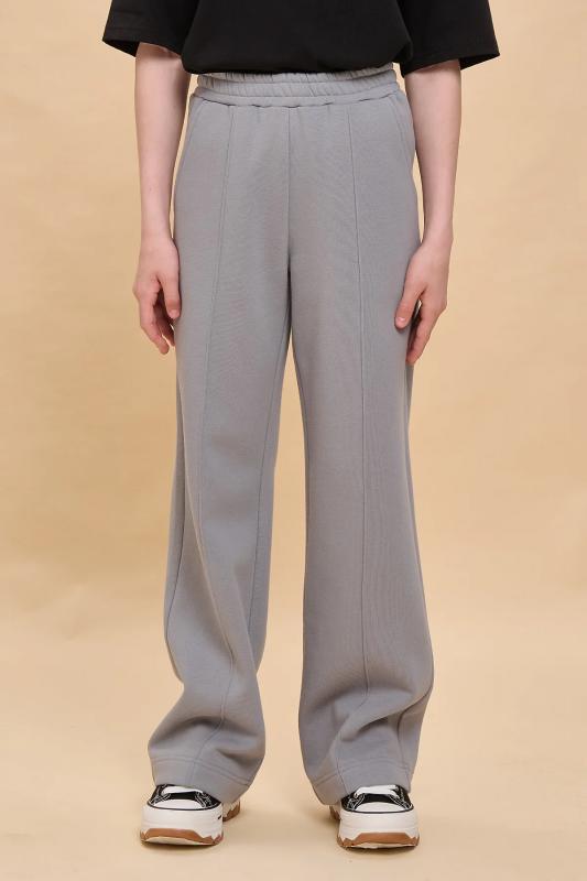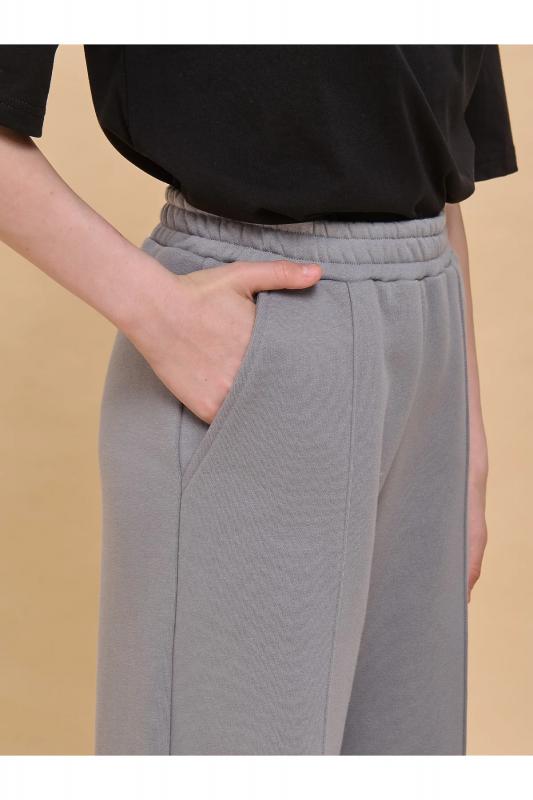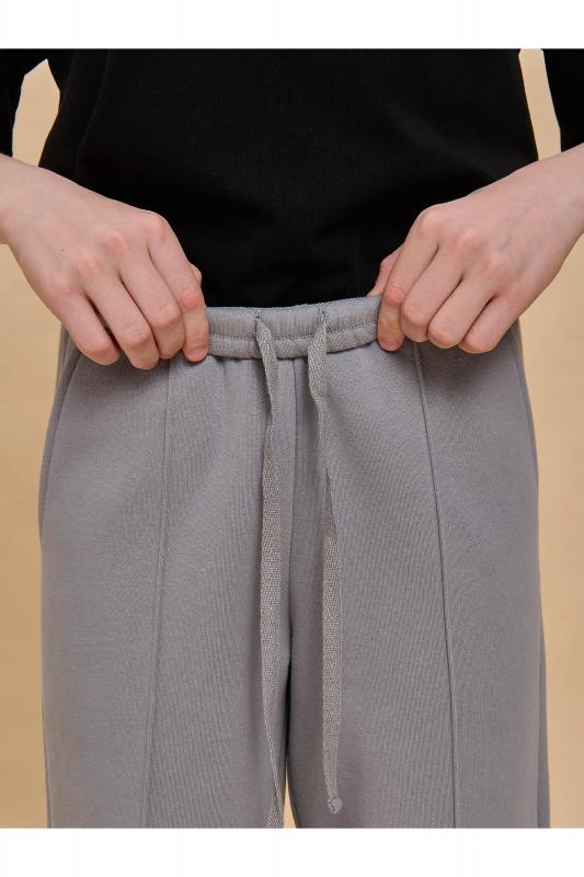 Прямые брюки из футера с начесом, с боковыми карманами и с застроченными стрелками по передним половинкам брюк. В поясе внутренняя утяжка на шнурок. По низу брюк обычная подгибка.