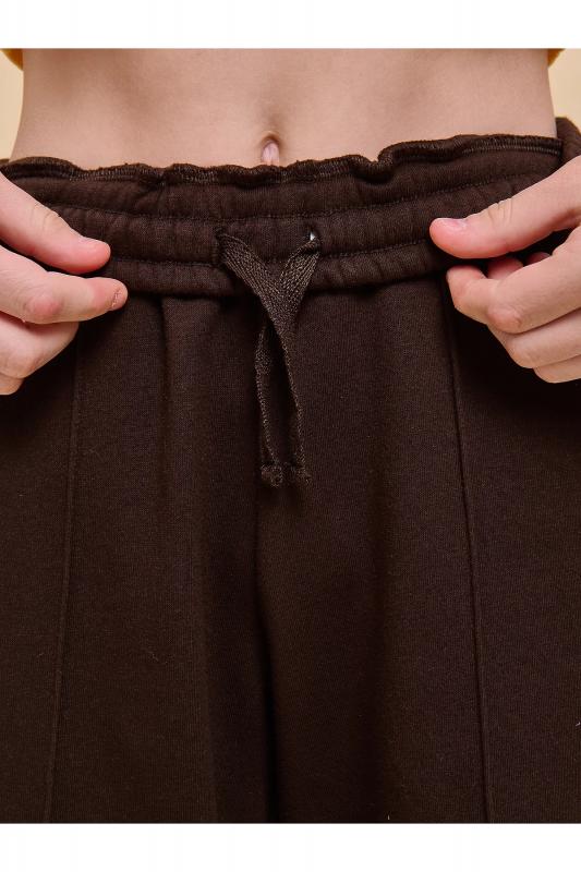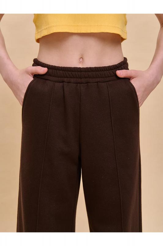 Прямые брюки из футера с начесом, с боковыми карманами и с застроченными стрелками по передним половинкам брюк. В поясе внутренняя утяжка на шнурок. По низу брюк обычная подгибка.