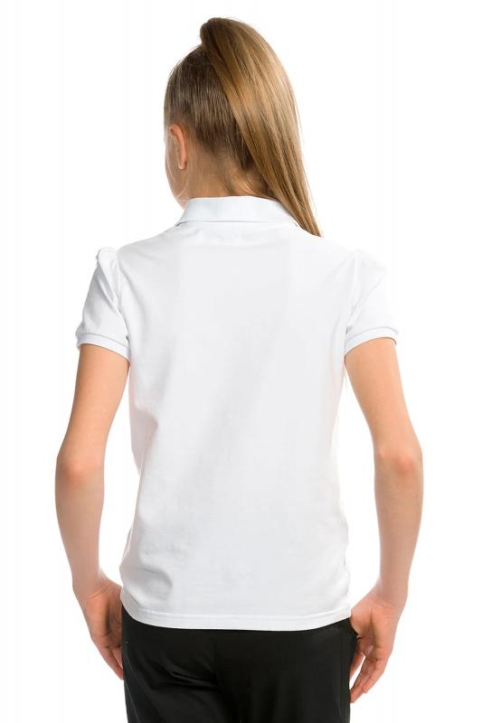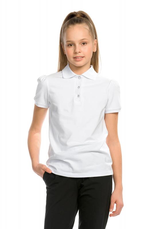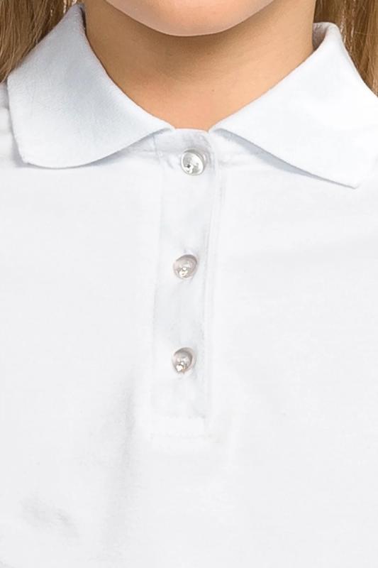 Футболка-поло для девочек из хлопкового трикотажа с эластаном. Рукав-фонарик умеренного объема, воротник вывязан из рибаны. Пуговки украшены стразинками.