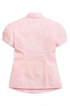 Блузка для девочек с коротким рукавом. Блузка классического полуприлегающего силуэта с рельефами по переду и спинке. Новая форма рукава с вертикальными защипами внизу и узкой манжетой. Под воротник на незаметную пуговку пристегивается съемная полосатая лента с жемчужинами на концах.