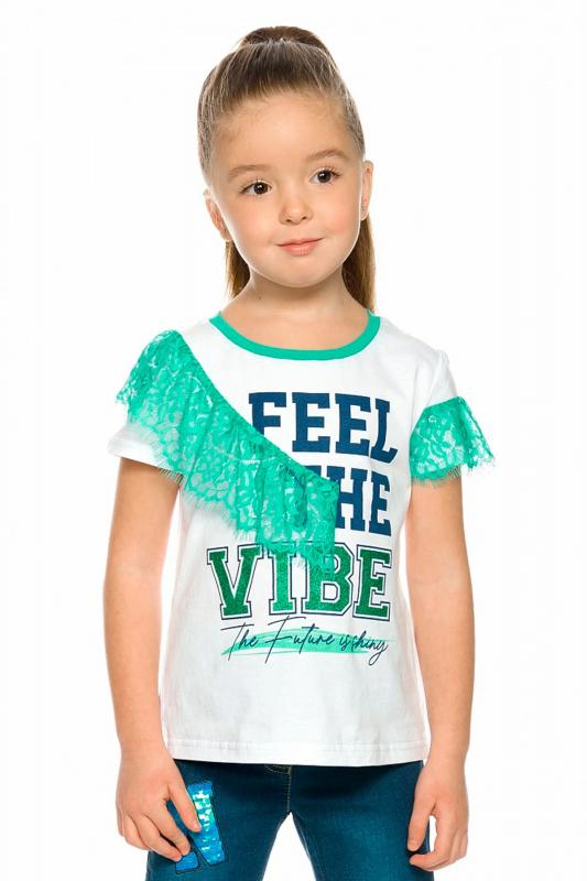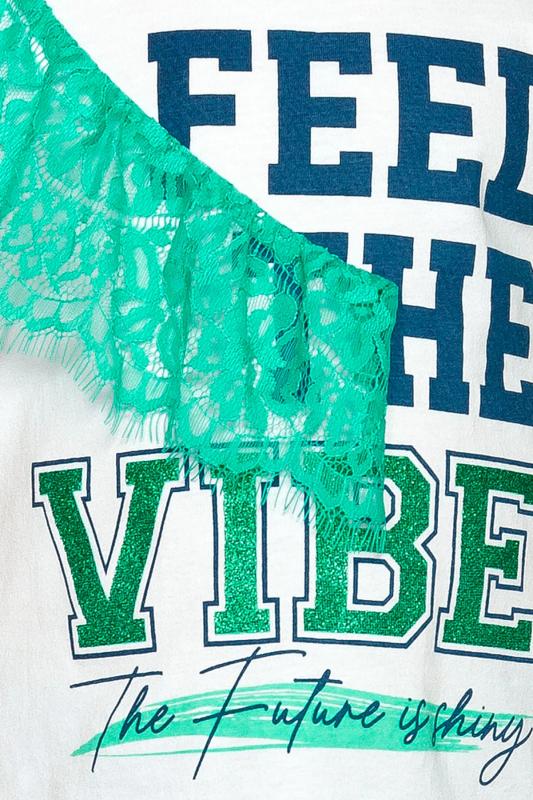 Футболка умеренного объёма с втачным рукавом. Стиль деконструктивизм выражается декором из контрастного мягкого кружева по правой стороне изделия и левому рукаву. Шрифтовая композиция с разноцветным глиттером, перевод Почувствуй настроение. Будущее блестяще .