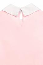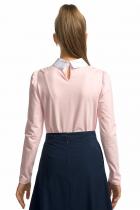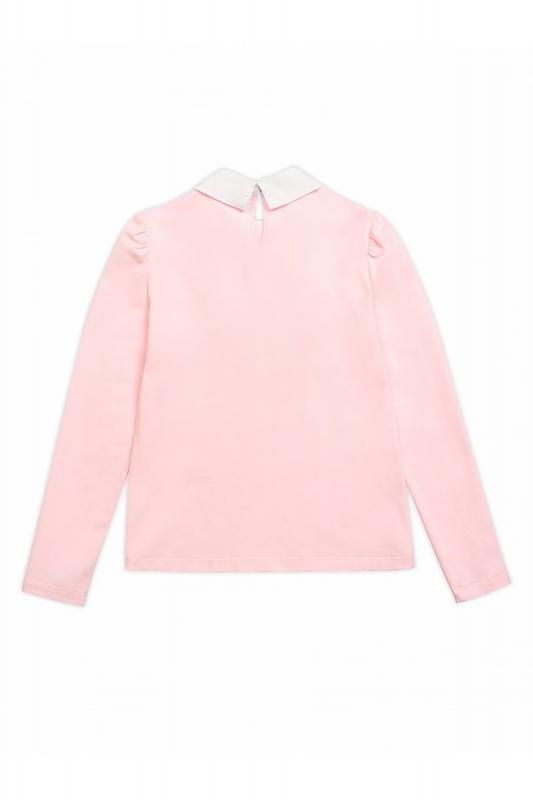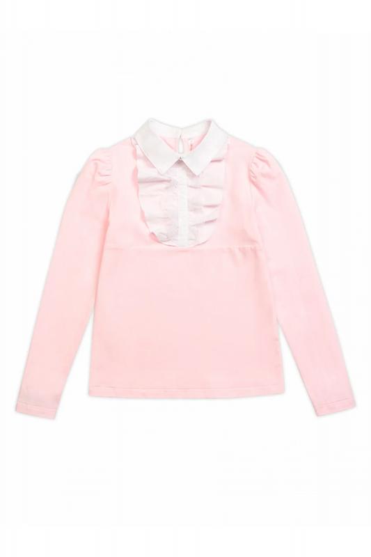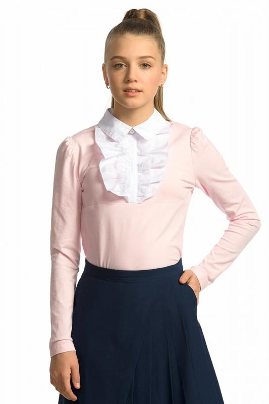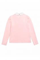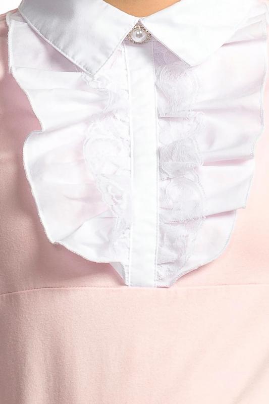Джемпер для девочек полуприлегающего силуэта с воротником из швейной ткани на отрезной стойке, имитирующим воротник рубашки. Перед украшает жабо из швейной ткани и кружева, собранное под вертикальную планку. Декор в виде брошки с жемчужиной и стразами. По спинке застежка на одну пуговицу. Умеренного объема рукав с небольшой сборкой по окату.