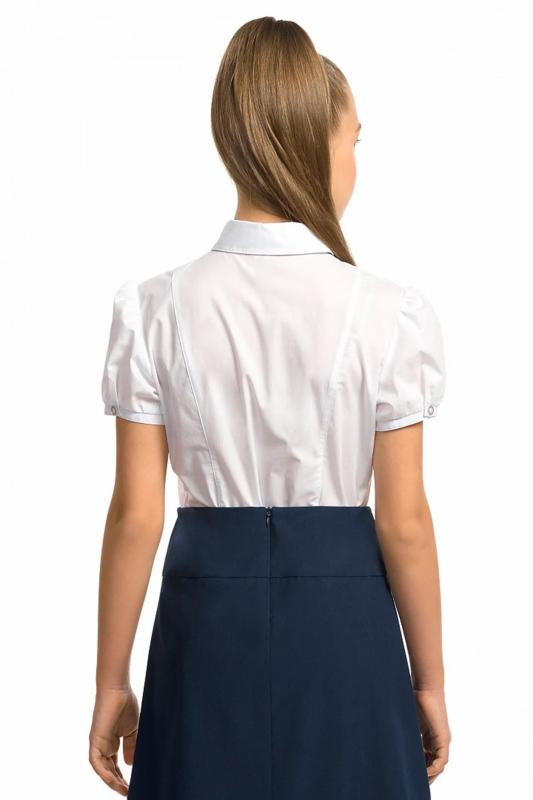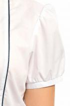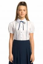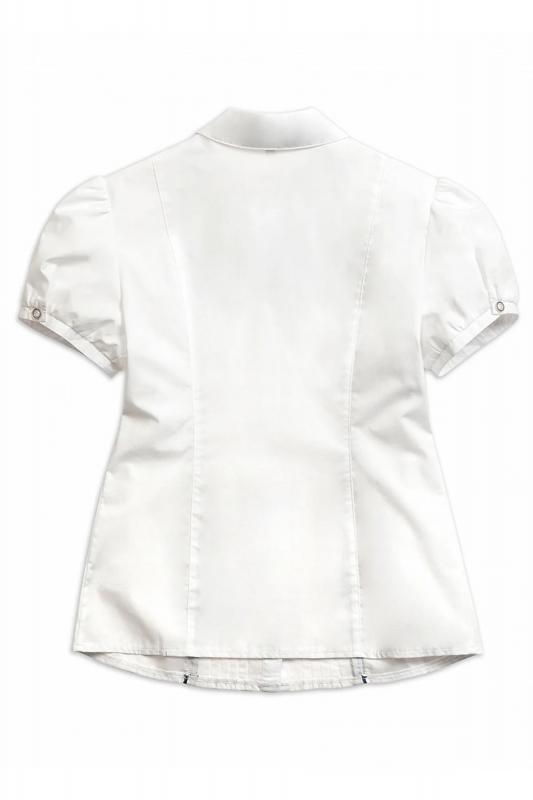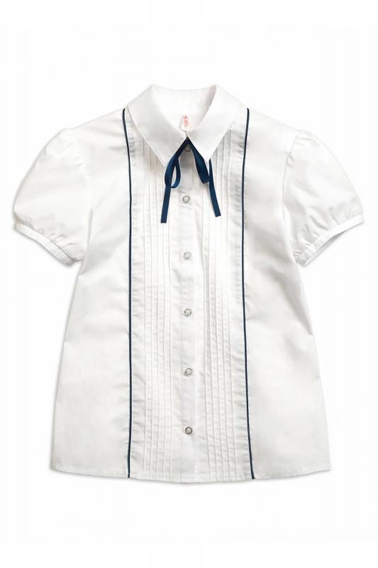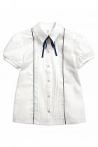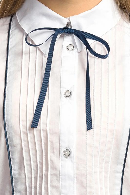 Блузка для девочек полуприлегающего силуэта с рельефами по спинке. По переду декоративная вставка с узкими вертикальными складками и контрастным сатиновым кантом. Рукав фонарик на узкой манжете с застежкой на пуговицу. Воротник на стойке с увеличенным отлетом актуальной формы. По центру стойки воротника настрочена узкая тесьма, которая завязывается на бант спереди.