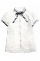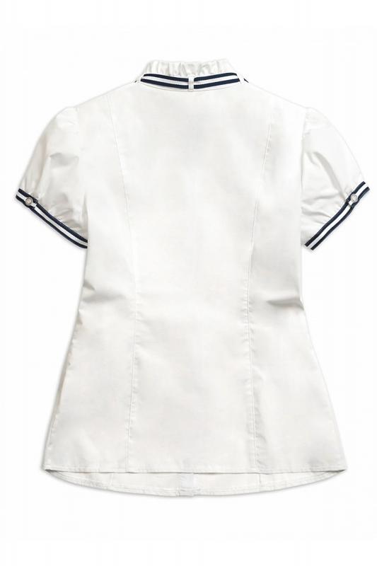 Блузка для девочек полуприлегающего силуэта с рельефами по спинке и переду. Рукав фонарик по низу фиксируется узкой манжетой из декоративной тесьмы. Воротник стойка с рюшей по верхнему краю декорирован съёмной сатиновой тесьмой, которая продета в шлёвки по спинке воротника. Спереди от стойки расходятся декоративные лучи вытачки.