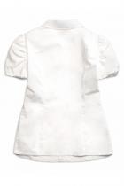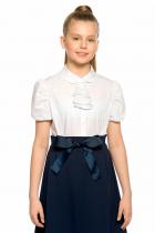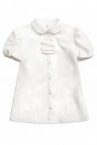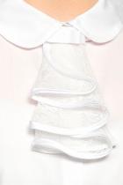 Блузка для девочек полуприлегающего силуэта с рельефами по переду и спинке. Рукав фонарик. Низ рукава мягкий, слегка присборенный на эластик, внутри подхвачен подкладом из сетки для большего объема. Декор в виде съёмного жабо из кружева, которое обработано атласным кантом. Жабо закреплено бантиком из репсовой ленты.