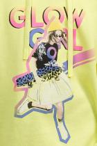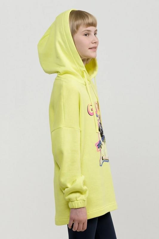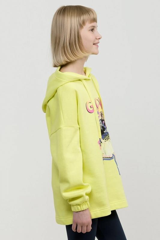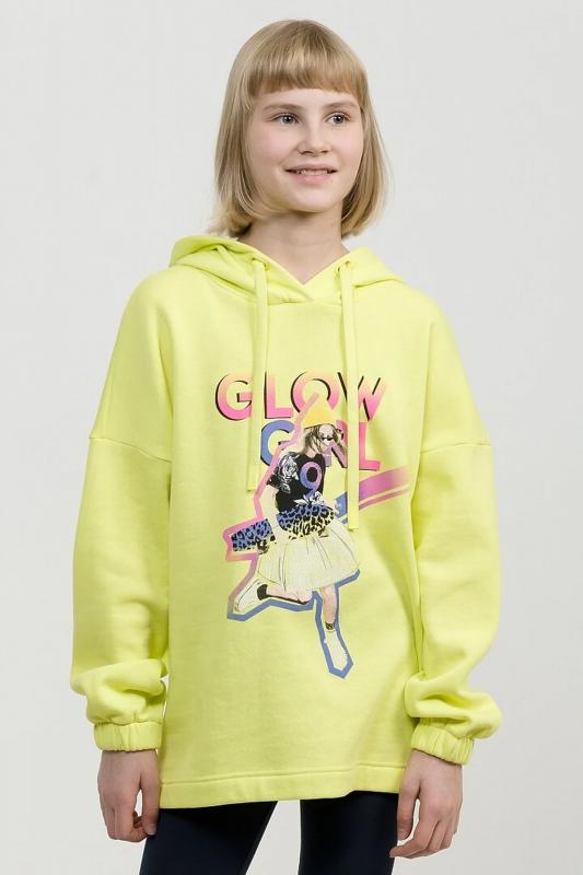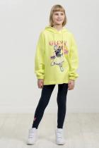 Свободное удлиненное худи оверсайз силуэта из футера с начесом. Сильно спущенное плечо, широкий рукав на манжете с внутренней широкой резинкой. Капюшон двухшовный с люверсами и утяжкой в виде шнурка с новой обработкой концов. Принт в ярких неоновых цветах с градиентом и элементами граффити. Перевод Светящаяся девушка.