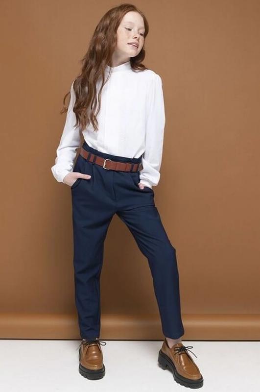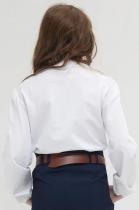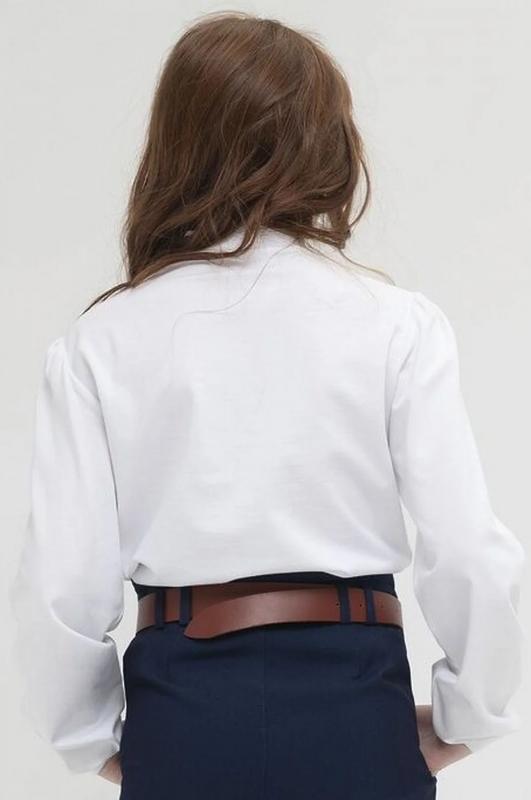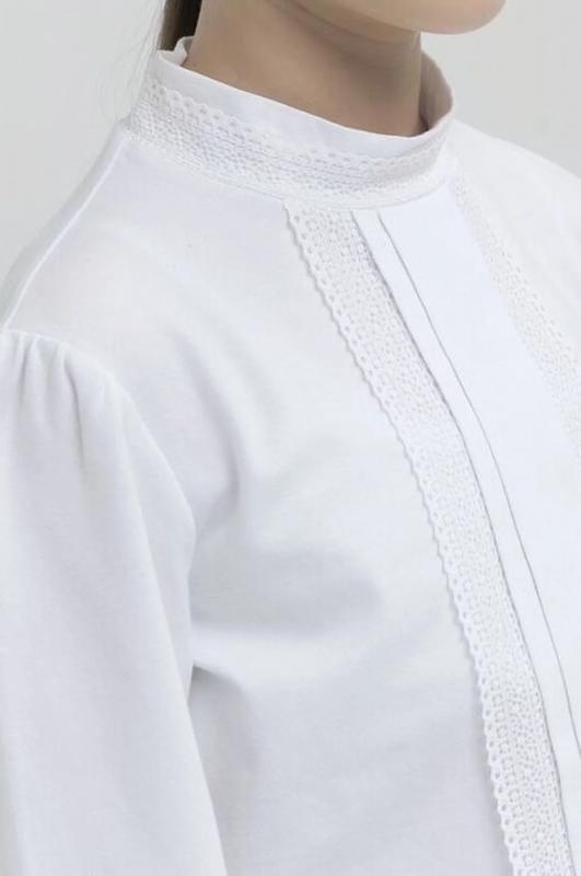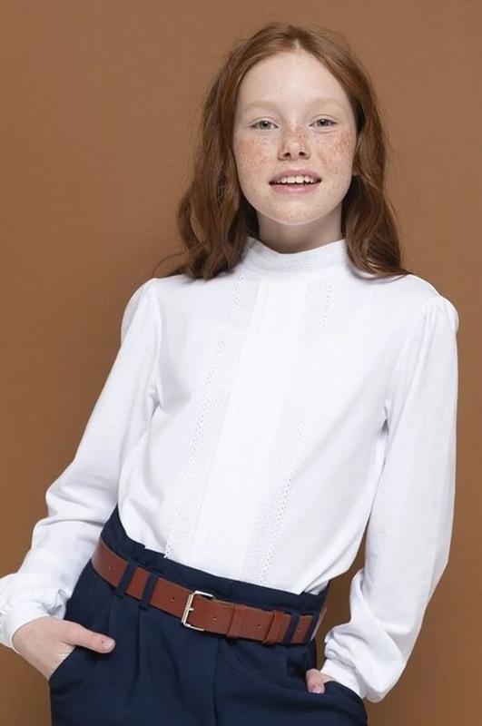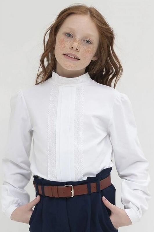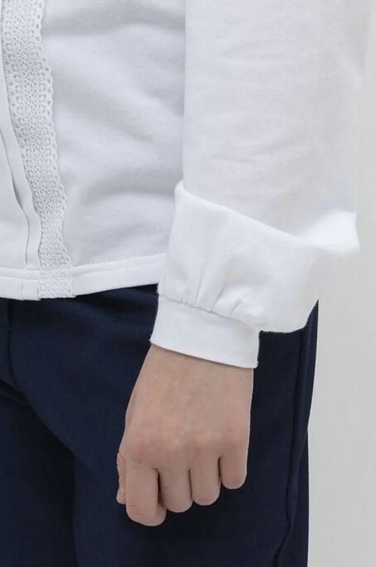 Школьный джемпер для девочки из хлопкового трикотажа. Мягкая ткань хорошо пропускает воздух, не электризуется. Кружево по бокам центральной складки спереди и по воротнику, а также лёгкая сборка рукава вносят немного романтики в классический стиль блузки. Практичен в повседневной носке, не растягивается и не теряет цвет после стирок.