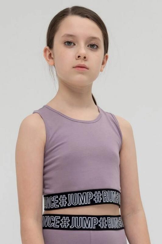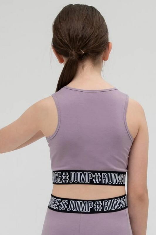 Современная спортивная майка топ для девочки из натурального материала. Плотная, хорошо тянется, приятная к телу. Не давит и не натирает по краям. Широкий эластичный низ с мотивирующим текстом, #танцуй#прыгай#бегай (перевод) плотно, но мягко фиксирует топ на месте. Он не будет подниматься вверх при активных движениях и врезаться в кожу. В этом топе учтены все особенности и потребности детского организма. Чтобы ничего не отвлекало его от занятий.
