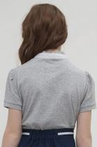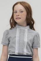 Школьная футболка для девочки из хлопкового трикотажа. Мягкая ткань хорошо пропускает воздух, не электризуется. Кружево по бокам центральной складки спереди и по воротнику, а также лёгкая сборка рукава вносят немного романтики в классический стиль. Практична в повседневной носке, не растягивается и не теряет цвет после стирок.