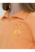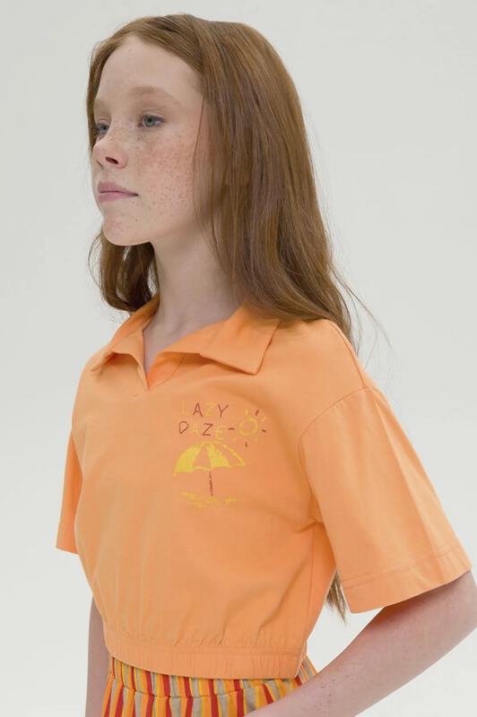 Укороченная футболка-поло для девочки - тренд сезона. Выполнена из хлопкового трикотажа. Не вызывает аллергии и отлично пропускает воздух. Кроп-топ свободного покроя со спущенным плечом и воротником-апаш с расходящейся планкой - для самых модных девочек. Низ изделия присобран на резинку и образует напуск для создания легкого объема. Ненавязчивый принт задаст настроение. Перевод "