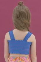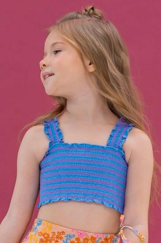Кроп-топ из 100% хлопка для девочки. Ткань изделия дышащая и комфортная. По всей ширине модель украшена сборкой, которая выполнена эластичной нитью контрастного цвета — один из актуальных летних трендов. Кроп-топ лаконичного дизайна, поэтому его легко сочетать с различными шортами, юбками и леггинсами. С ним можно создать много разных образов. При этом он практически не займёт места в чемодане. Отличный выбор для летнего отдыха и путешествий.