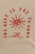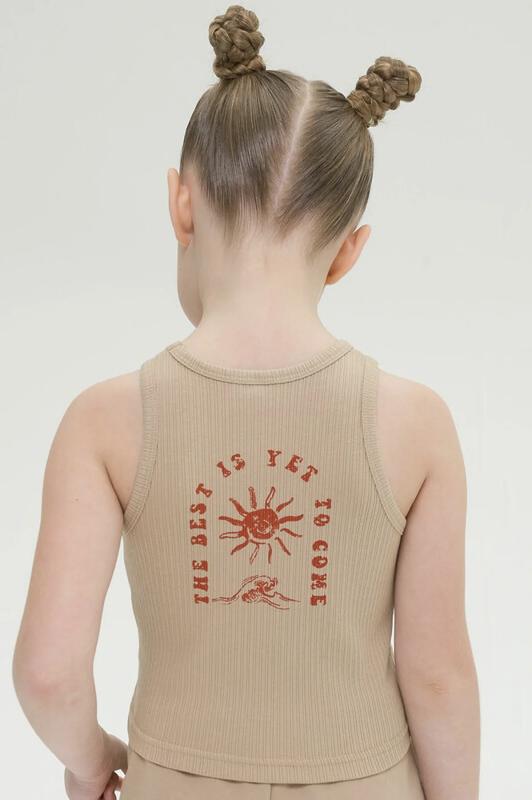 Легкая, летняя майка в рубчик для девочек - базовая модель на каждый день. Выполнена из хлопкового кашкорсе. Отлично пропускает воздух, быстро сохнет, не растягивается. Безупречный крой и фактура ткани дарит максимальный комфорт. Горловина и пройма обработаны широким пайпингом из основной ткани не растягиваются, держат форму - один из самых актуальных трендов сезона. На спине принт с эффектом состаренности, словно потрескавшаяся краска на солнце, перевод "