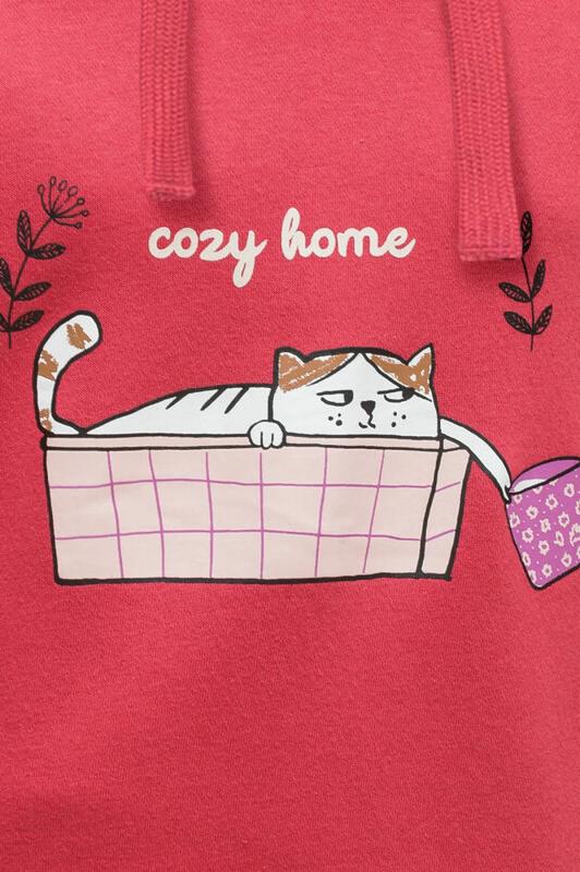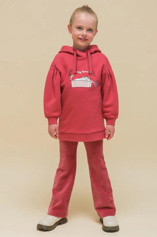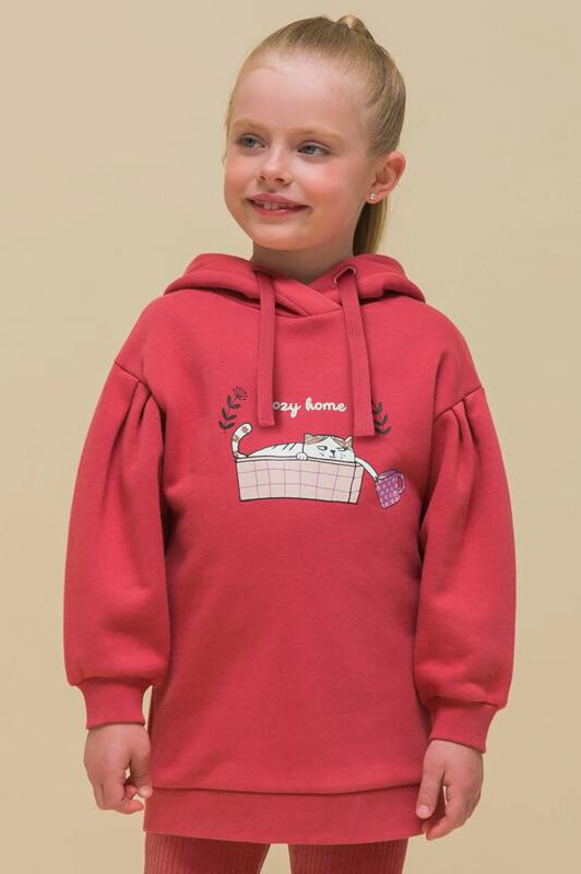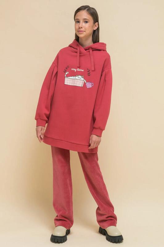 Худи детское удлиненное для девочки. Туника актуального оверсайз-силуэта со спущенным плечом подарит ребёнку комфорт и свободу движения. На рукавах красивые глубокие складки. Объёмные рукава — один из модных трендов сезона. По низу изделия и низу рукавов манжеты из эластичной рибаны (ткань в рубчик), они не растягиваются и сохраняют форму и отличный внешний вид надолго. Капюшон с двумя швами, что обеспечивает анатомически правильную форму и комфортную посадку по голове. Объём капюшона регулируется тесьмой, продетой в крупные люверсы. Капюшон двойной - швы не видно. Худи оверсайз с принтом на груди. Принт эластичный и прочный, без проблем переносит частые стирки. Милый принт изображает котика в корзине с чашкой, надпись переводится: «уютный дом». Худи для девочек неприхотливо в уходе. В составе ткани преобладает высококачественный хлопок — толстовка мягкая и прекрасно пропускает воздух, давая коже ребёнка дышать. Благодаря полиэстеру изделие легко стирается и быстро сохнет, сохраняет первозданную форму надолг