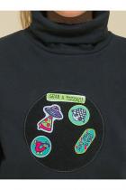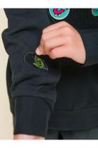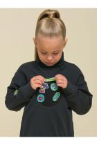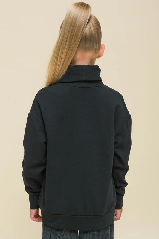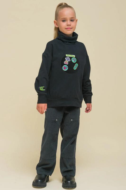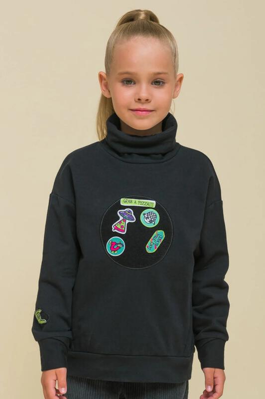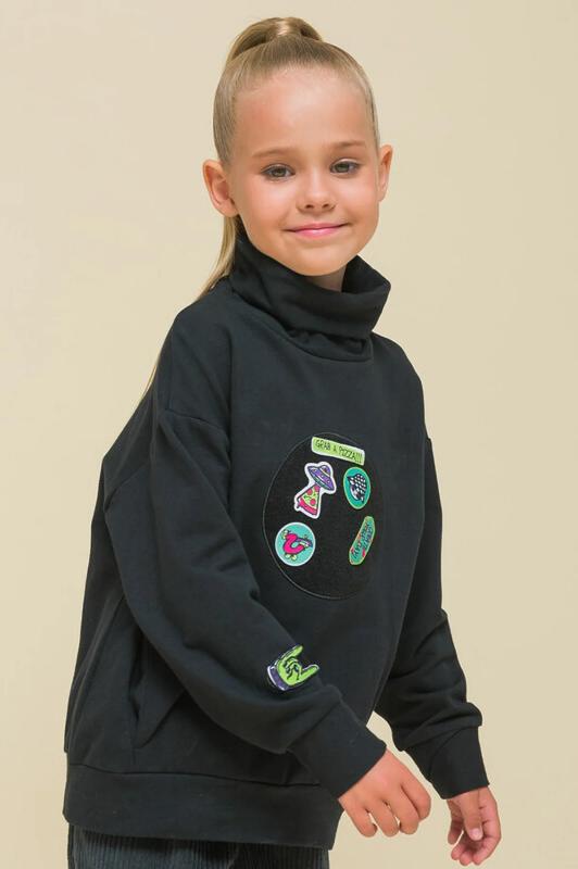 Детский свитшот для девочки. Лонгслив модного оверсайз-силуэта со спущенным плечом подарит ребёнку комфорт и свободу движений. Джемпер с воротником- стойкой. Его можно носить двумя способами: в два сложения — как у классической водолазки — и без отворота — актуально, стильно. По переду оригинальные рельефы, в которых прячутся карманы. По низу изделия и на рукавах манжеты из основной ткани. На манжетах рукавов отверстия для большого пальца — можно носить как митенки или как обычные манжеты. Модель неприхотлива в уходе. В составе ткани (футер с начёсом) преобладает качественный хлопок — джемпер мягкий и отлично пропускает воздух, давая коже ребёнка дышать. Эластан помогает изделию сохранить прекрасную форму надолго. Свитшот с оригинальным декором — «собери принт». Патчи на велкро (липучке) можно складывать в аппликации по своему желанию — такая необычная возможность творчества порадует ребёнка! В наборе несколько рисунков и надписей, надписи переводятся: «создай свой день!», «хватай пиццу!» Оверсайз-свитшот вы