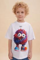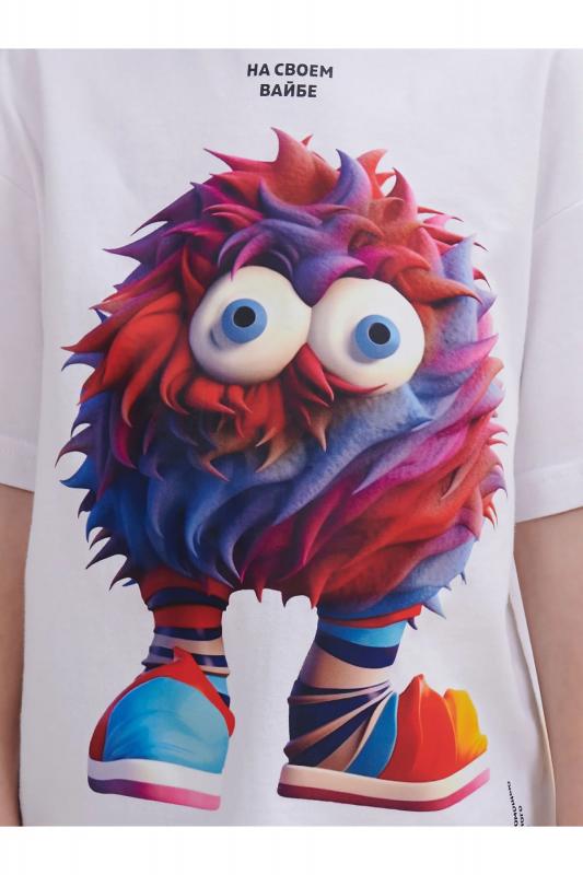 Детская футболка оверсайз. Комфортный джемпер свободного силуэта со спущенным плечом не будет стеснять движений ребёнка. Объёмная майка подарит ощущение комфорта и уюта. Вырез горловины отделан эластичной рибаной (ткань в рубчик) — она прекрасно держит форму, при этом ребёнку удобно надевать и снимать футболку. Модель неприхотлива в уходе. Главная фишка футболки — яркий стильный принт, изображающий персонажа, сгенерированного нейросетью (искусственным интеллектом). Это супермодный тренд! Футболка с прикольным принтом по переду выполнена из 100% высококачественного хлопка — изделие мягкое и воздухопроницаемое, что позволяет коже ребёнка свободно дышать. Принт эластичный и стойкий — без проблем переносит многочисленные стирки, не теряя своей яркости. На принте изображён смешной яркий пушистый чудик в полосатых носках + надписи "