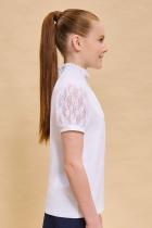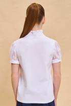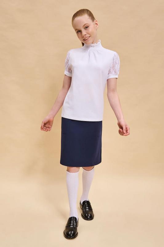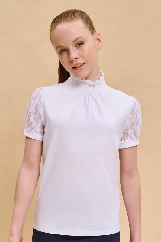 Школьная блузка с кружевными рукавами для девочки. Комфортная и мягкая трикотажная блузка умеренного объёма хорошо садится на девочек с разной фигурой и не сковывает движений ребёнка. Рукава выполнены из оригинального кружевного эластичного полотна с нежным девичьим узором. По низу рукавов узкие манжеты из основного материала. Блузка дополнена воротником-стойкой с эластичной сборкой — удобно надевать и при этом элегантно смотрится. По переду модель декорирована небольшой деликатной сборкой. В составе ткани преобладает качественный хлопок — ребёнку не жарко, кожа дышит. Благодаря полиамиду блузка в школу для девочки хорошо сохраняет форму и первозданный внешний вид. Модель однотонная, без принта. В ассортименте представлены блузки для девочек школьные универсальных цветов. Они легко сочетаются с различными брюками, юбками, сарафанами. Блузка детская подходит как для повседневной носки в школу, так и для более торжественного случая — в зависимости от того, с чем её надеть. Отличный выбор школьной формы для ваш