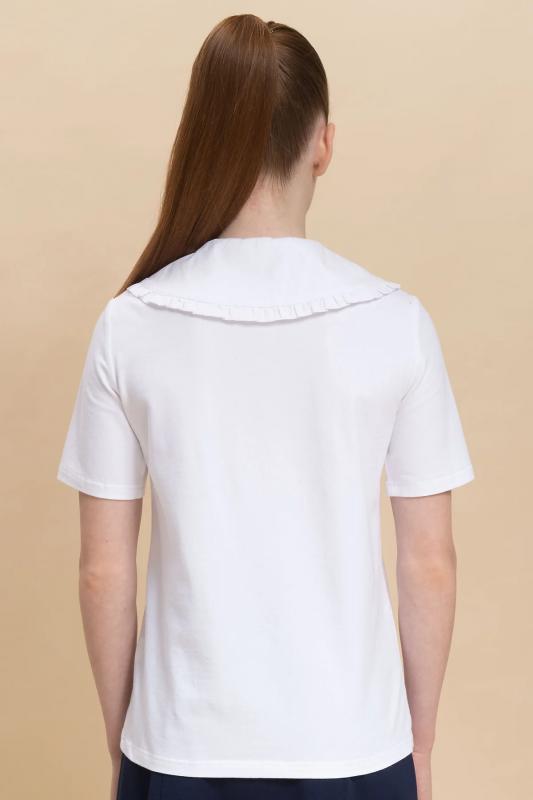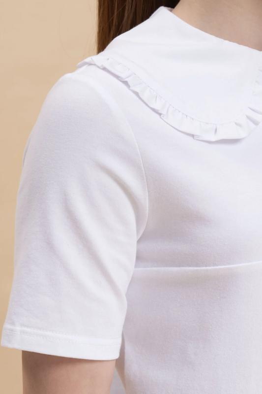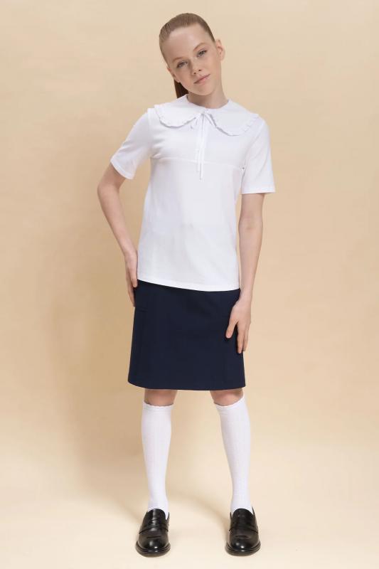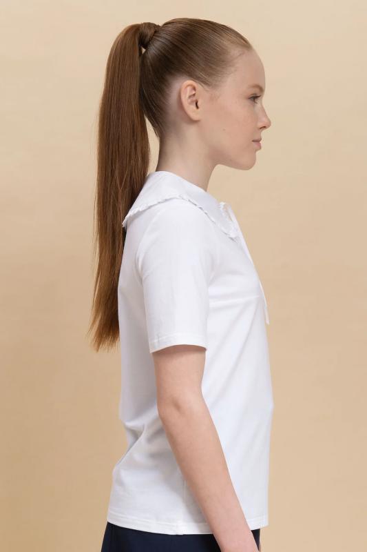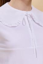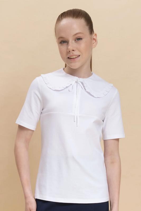 Школьная блузка для девочки. Комфортная трикотажная блузка умеренного объёма хорошо садится на девочек с разной фигурой и не сковывает движений ребёнка. По переду планка с застёжкой на пуговицы — ребёнку удобно надевать и снимать блузку. Модная фишка изделия — большой фигурный воротник из швейной ткани, украшенный рюшем (суперактуальный «воротник Уэнсдэй»). Сзади под воротником пришита узкая декоративная тесьма, которая завязывается спереди на бантик под воротником. Блузка в школу для девочки выполнена из ткани с высоким содержанием качественного хлопка — ребёнку не жарко, кожа дышит. Благодаря полиамиду в составе материала блузка детская хорошо сохраняет форму и первоначальный внешний вид. Модель однотонная, без принта. В ассортименте представлены блузки для девочек школьные универсальных цветов. Они легко комбинируются с различными брюками, юбками, сарафанами. Такая блузка подходит как для повседневной носки в школу, так и для более торжественного случая — в зависимости от того, с чем её надеть. Идеальный