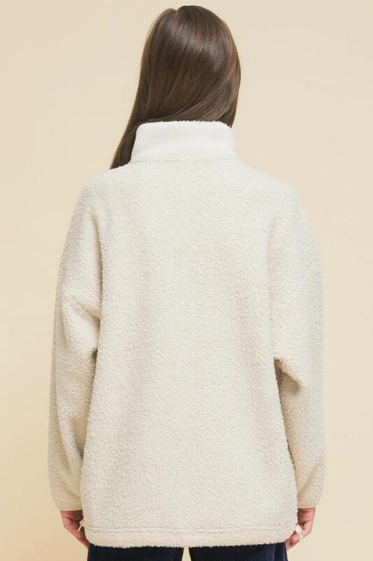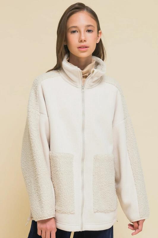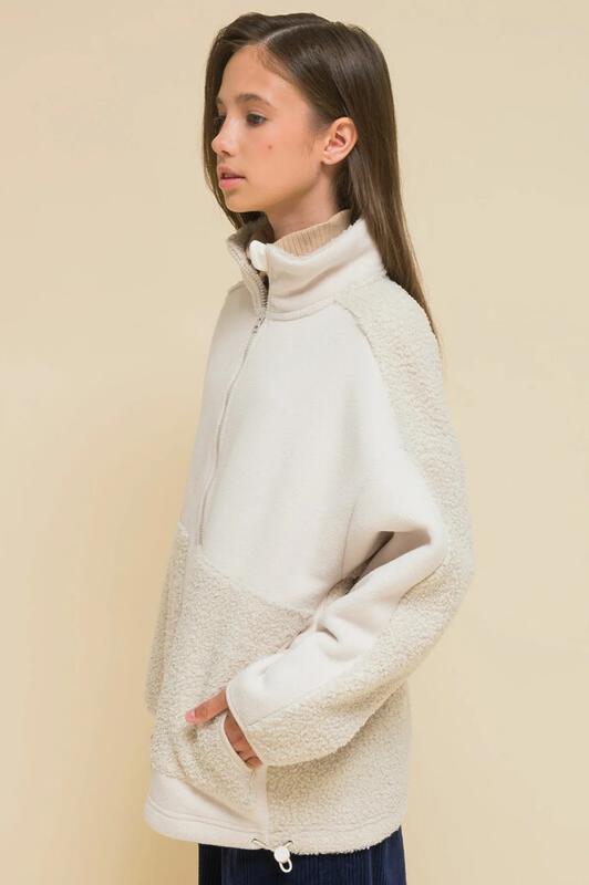 Детское худи для девочек выполнено из мягкого бербер-флиса (фактура «барашка»). Вставки по переду и рукавам, а также внешняя часть воротника — из футера с начесом. Сочетание материалов с разной фактурой — один из модных трендов. Куртка оверсайз-силуэта со спущенным плечом подарит ребёнку комфорт и свободу движения. Толстовка с воротником-стойкой защищает шею от холода и ветра, нет необходимости дополнительно надевать шарф. Внутренняя сторона воротника выполнена из мягкого и приятного на ощупь бербер-флиса. Спереди застёжка на молнию. По низу изделия, по бокам утяжка на эластичный шнур — можно регулировать объём. Большие фигурные накладные карманы из бербер-флиса — удобно пользоваться. Худи однотонное, без принта. За ним просто ухаживать. Одежда из бербер-флиса тёплая, лёгкая, мягкая, просто стирается и быстро сохнет, не выгорает и не скатывается, надолго сохраняет первоначальную форму. Толстовка представлена в двух трендовых цветах: красный и бежевый (молочный оттенок). Она легко комбинируется с различными б