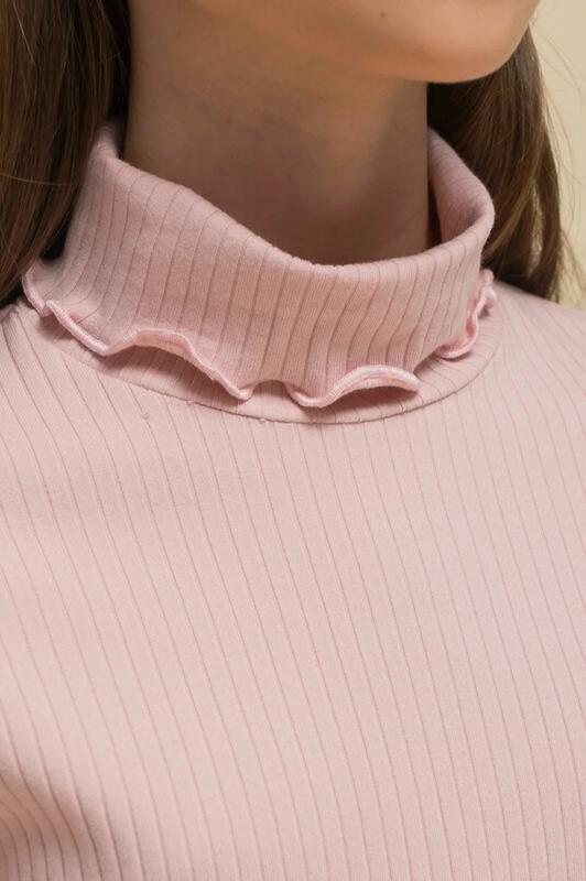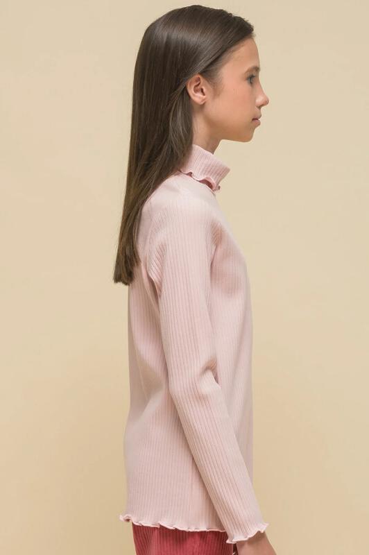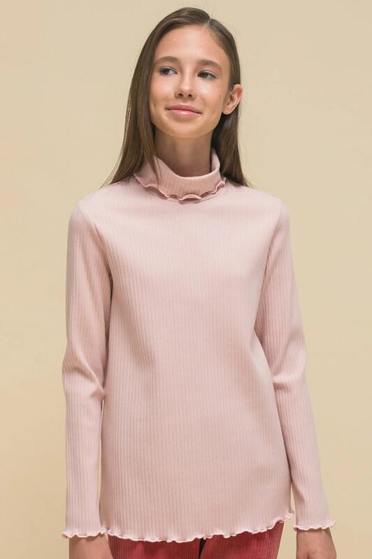 Водолазка в рубчик для девочки. Джемперы из ткани в рубчик (кашкорсе) — один из модных трендов. Водолазка умеренного объёма со спущенным плечом подарит ребёнку комфорт и не будет стеснять его движений. Водолазка-лапша с высоким воротником-стойкой защищает шею от холода и ветра — можно не надевать дополнительно шарф. Джемпер украшает декоративная закрутка по воротнику и низу рукавов. Модель однотонная, без принта. За джемпером просто ухаживать. В составе ткани преобладет высококачественный хлопок — водолазка притяна на ощупь и великолепно пропускает воздух, позволяя коже ребёнка дышать. Эластан помогает изделию сохранить первоначальную форму в течение длительного времени. Водолазка представлена в трёх трендовых цветах: бежевая водолазка (песочный оттенок), голубая и розовая (пудровый оттенок). Размерная линейка: 1 (86): 2 (92): 3 (98): 4 (104): 5 (110): 6 (116): 7 (122): 8 (128): 9 (134): 10 (140): 11 (146). Замечательная водолазка на девочку дошкольного и младшего школьного возраста, а также подростка. Подхо