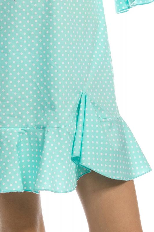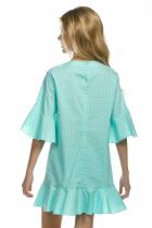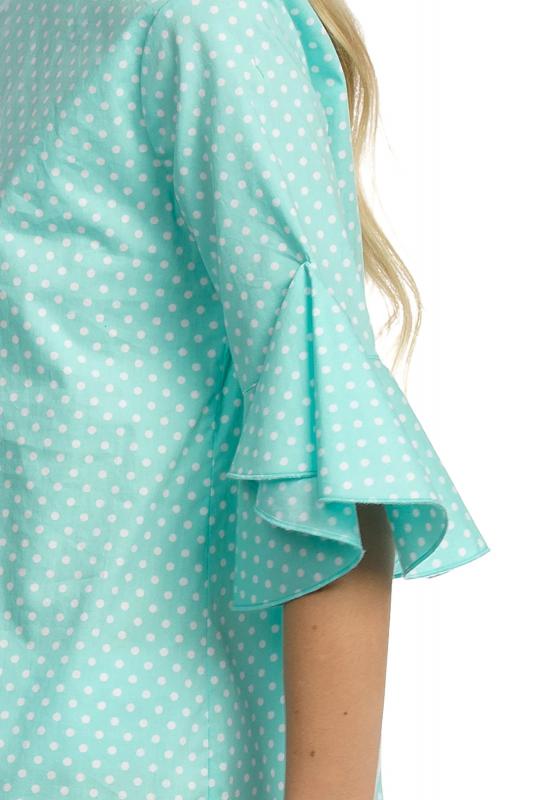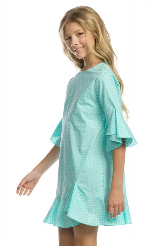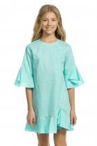 Платье для девочек. НОВИНКА! Платье нового силуэта с притачным воланом по низу переда, спинки и рукавов из ткани в горошек. На спинке центральный шов и аккуратный разрез у горловины с потайной пуговкой. Необычный фигурный способ притачивания волана спереди сбоку и на рукаве создает интересные фалды.