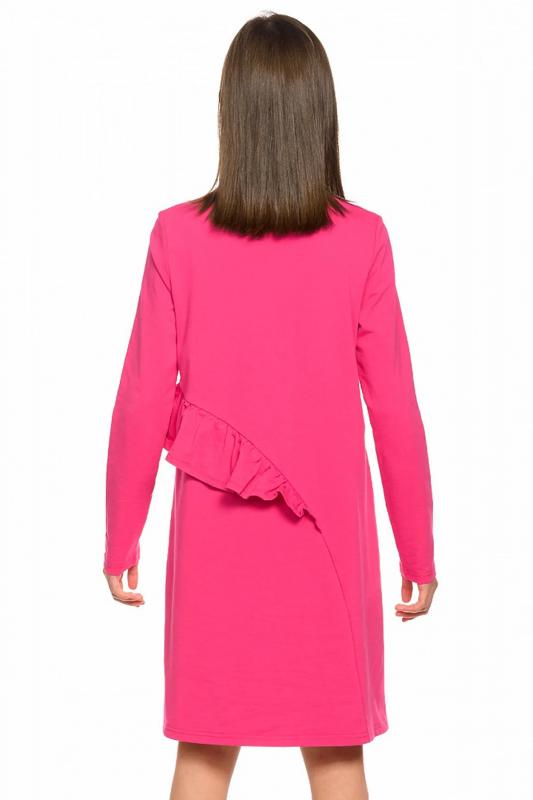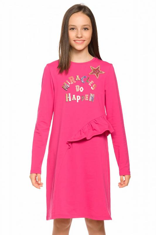Платье для девочек из футера А силуэта. Аккуратный втачной рукав, небольшая горловина. Фишка декоративный асимметричный рельеф необычной округлой формы по переду и по спинке до низа изделия. В рельеф вставлен волан. Rubber принт с золотым металликом и глиттером. Надпись Чудеса случаются. Вуаля.