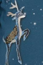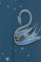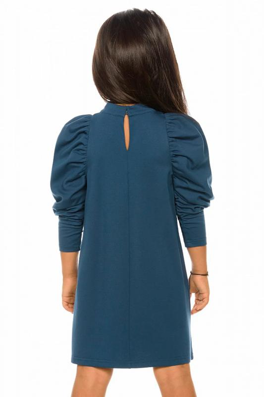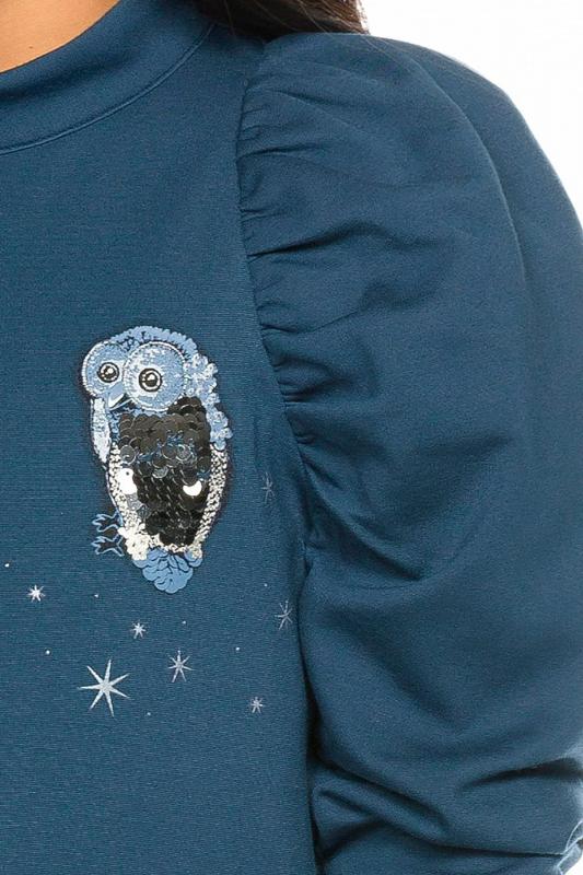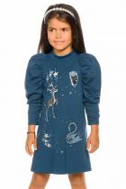Нарядное платье, слегка расширенное к низу. Горловину украшает изящная стойка, застёжка на две пуговицы по спинке. Фишка платья в пышных рукавах, объём которых достигнут за счет густой сборки оката. Сборка рукава по внутреннему шву на эластик позволяет регулировать длину. Перед декорирован сказочным принтом с серебряным металликом и пайетками.