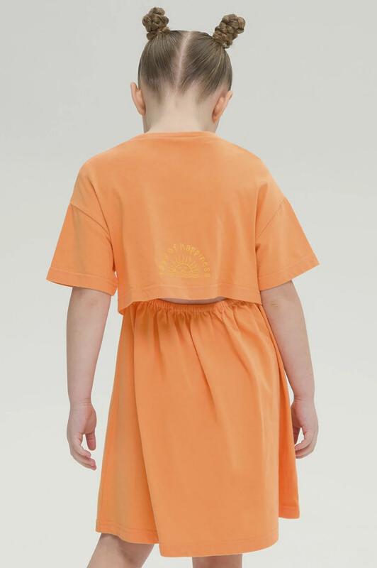 Платье для девочки. Красивое, лёгкое, летнее. 100% хлопок. Благодаря этому платье мягкое, комфортное и приятное на ощупь. Изделие длиной до колена, слегка расклешенное к низу со спущенным плечом. Оригинальности платью придают отлетная кокетка до линии талии по спинке и пояс, собранный на резинку, благодаря чему спинка обдуваемая, в самую жаркую погоду девочке будет комфортно. Изюминка модели - деликатный мягкий принт на кокетке сзади. Оно отлично сочетается с любой обувью, в том числе спортивной. Данная модель станет отличным выбором как платье в садик, для прогулки и для путешествий. Яркий цвет задаст настроение.