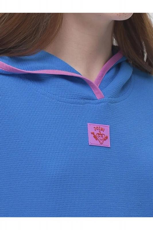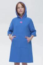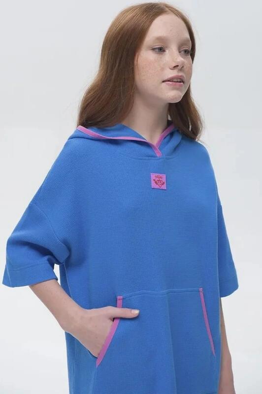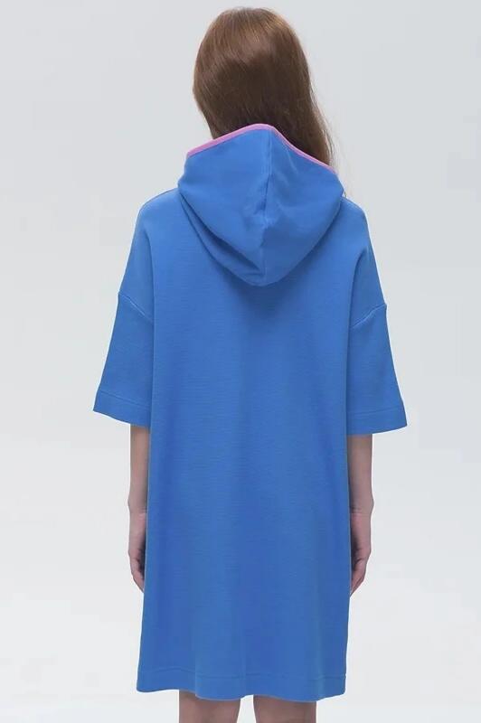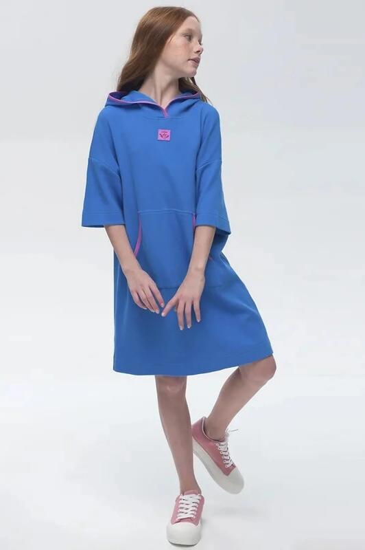 текстуры. В составе ткани преобладает хлопок, поэтому модель комфортная, приятная на ощупь, в ней не будет жарко летом. Эластан в составе ткани помогает изделию сохранять форму. Ткань проста в уходе. Объёмный капюшон защитит от солнца. Модный оверсайз-силуэт позволяет носить платье долго. Эта модель идеально сядет на девочку любой фигуры, можно покупать без примерки.