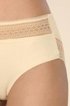 Трусы женские слипы, высокая посадка. В новой коллекции женского белья представлены трусы слипы из кашкорсе с отделкой кружевом, с высокой посадкой, с эластичной резинкой по краю. Трусики созданы из полиамида в рубчик, такой материал не просвечивает, имеет приятную рельефную поверхность и красиво сочетается с кружевными вставками. В составе ткани женских трусов прочный эластичный полиамид. При многократной стирке материал не линяет, кружево не растягивается, не теряет первоначальный вид. Ткань устойчива к пилингу (образованию катышков). Женские трусы с низкой посадкой обладают гигроскопичностью, легко впитывают влагу, что обеспечивает комфорт на каждый день. Модель в двух классических цветах – черный и телесный бежевый. Кружево в тон ткани спереди расположено по талии, сзади - по низу изделия. Базовое нижнее женское белье подходит под любую одежду, незаметно в любых сочетаниях. Белье для ежедневной носки очень удобное и будет отлично смотреться на фигуре, легко стирается и быстро сохнет. Хороший вариант пода