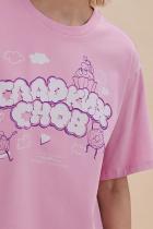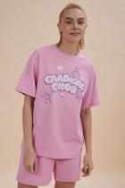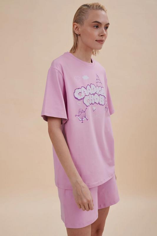 Домашний комплект женский с шортами и футболкой – комфортная повседневная одежда для дома. Домашняя одежда всегда должна быть изысканной, создавать чувство уверенности и красоты. Удобная футболка среднего объёма дарит комфорт и свободу движений. Модная майка-футболка с позитивным принтом – стильная деталь женского гардероба. Милый принт в виде сладостей с надписью актуальным шрифтом, напоминающим облака: "