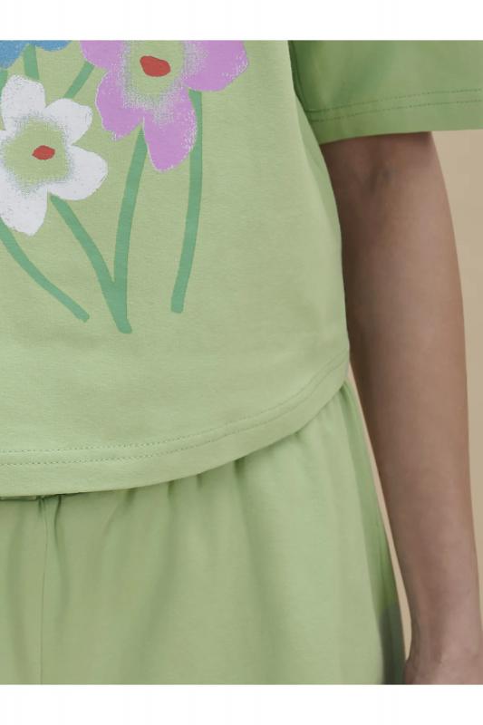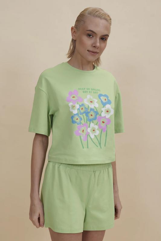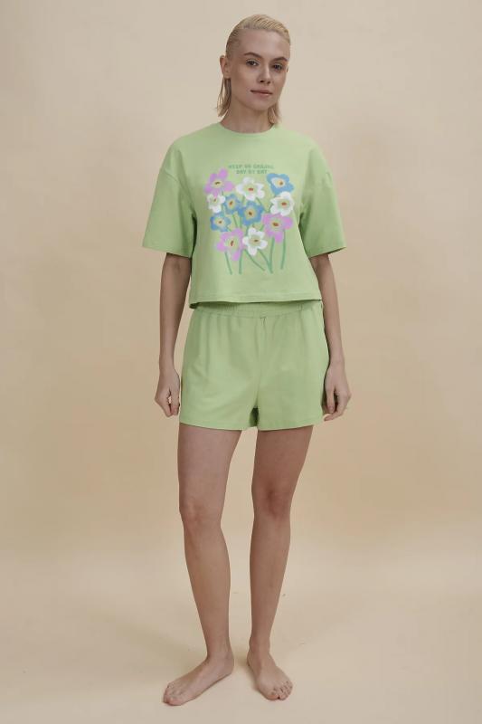Домашний комплект женский с шортами и футболкой – комфортная повседневная одежда для дома. Домашняя одежда всегда должна быть изысканной, создавать чувство уверенности и красоты. Кроп-топ модного дизайна дарит комфорт и свободу движений. Короткая майка-футболка с позитивным принтом – стильная деталь женского гардероба. Милый цветочный принт с летним настроением, надпись переводится: "