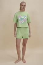 . Принт эластичный и мягкий, отлично переносит многочисленные стирки. В составе ткани изделия преобладает высококачественный хлопок – пижама мягкая и отлично пропускает воздух, давая коже дышать. Шорты свободного кроя, средней длины – для удобства и комфорта. Шортики женские на широкой эластичной резинке – она не давит и не перекручивается. В линейке представлены следующие размеры: XS (42), S (44), M (46), L (48), XL (50). Женский пижамный костюм подходит как женщинам, так и девушкам, девочкам-подросткам. Модель представлена в трёх актуальных цветах: голубом, зелёном и сиреневом (модн