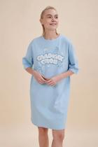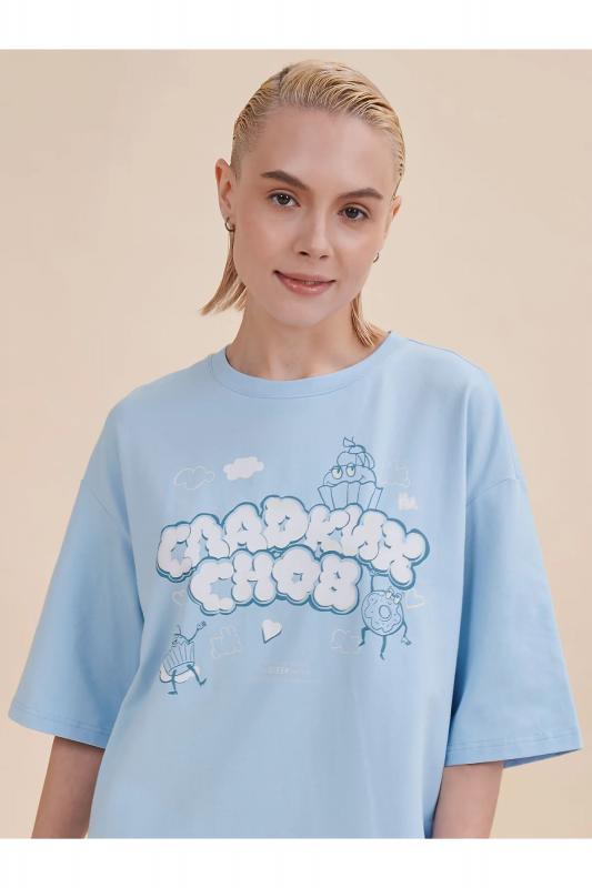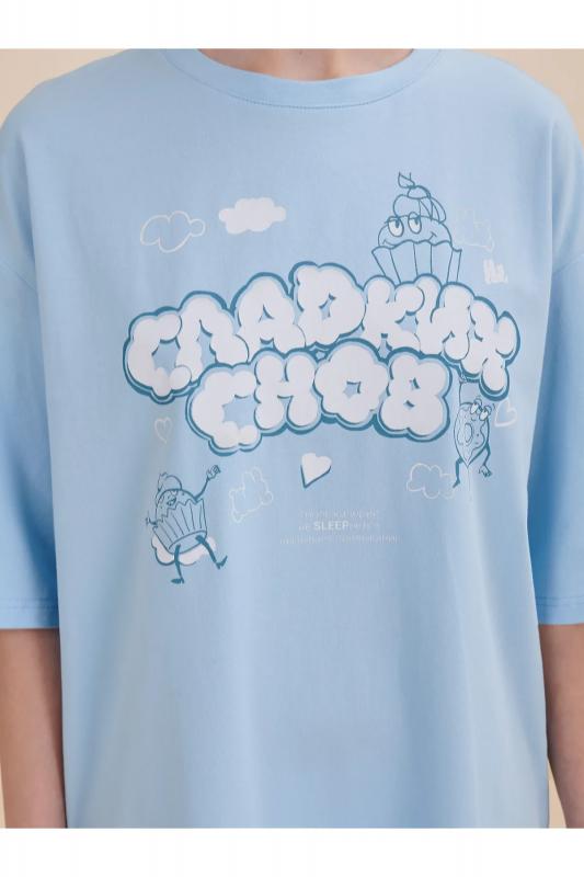 Стильное женское летнее платье футболка длиной до колена. Трикотажное платье оверсайз прямого кроя с коротким рукавом. Однотонное платье-футболка с принтом – базовый элемент женского гардероба. Повседневное платье свободного кроя подойдет для любой фигуры. В составе ткани изделия преобладает высококачественный хлопок – платье мягкое и отлично пропускает воздух, позволяя коже дышать. Эластан помогает модели надолго сохранить первоначальную форму. Милый принт в виде сладостей с надписью актуальным шрифтом, напоминающим облака: "