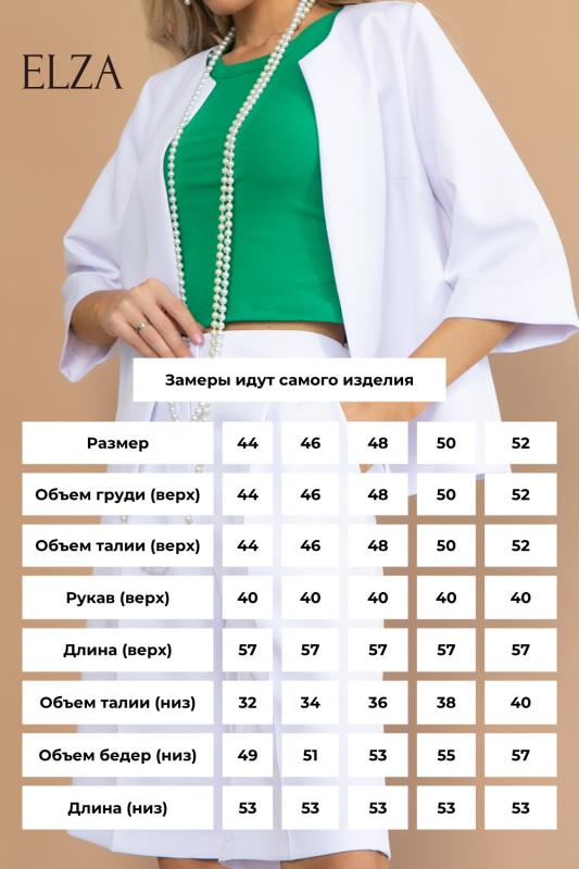 Шикарный универсальный костюм с бермудами. Этот премиум комплект подчеркнет ваш стиль и обеспечит максимальный комфорт. Ткань почти не мнется, имеет дорогой внешний вид и приятную фактуру. Каждый элемент костюма может носиться отдельно в сочетании с другими элементами гардероба, создавая утонченные и модные образы. Застежка бермудов гульфик по переду, по спинке талии резинка, Длины: ( жакет 44-52р- 57 см, бермуды 44р- 51 см,46-48р-53 см,50-52р-54 см). Размер изделия на модели: 44 Рост модели: 172 см Параметры модели: 88-63-96