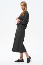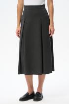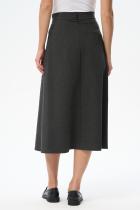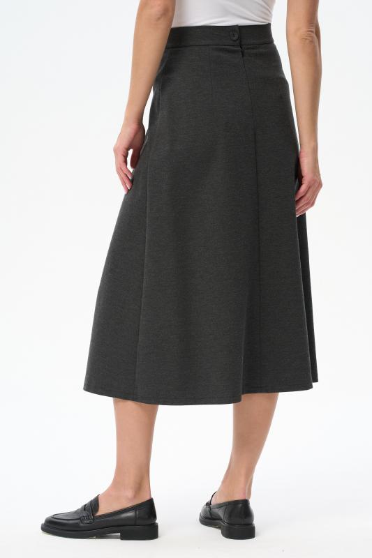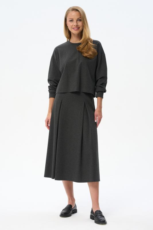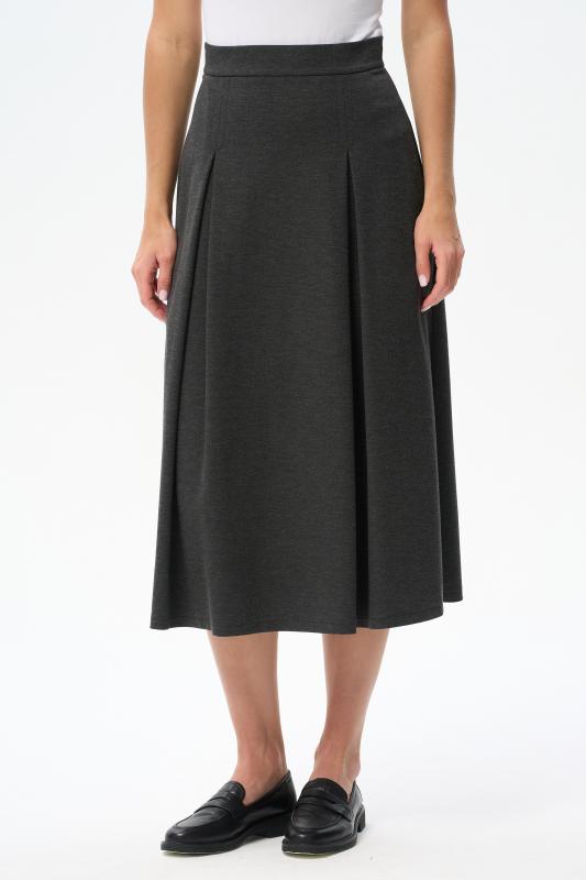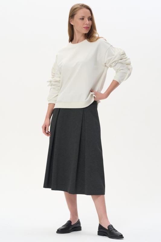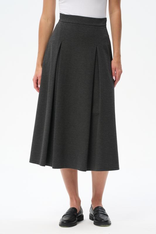 Юбка из поливискозного меланжевого полотна серого цвета с модными бантовыми складками. Спереди две мягкие складки, сзади вытачки и застежка - молния. Притачной пояс с застежкой на пуговицу. Рост модели на фото 178 см